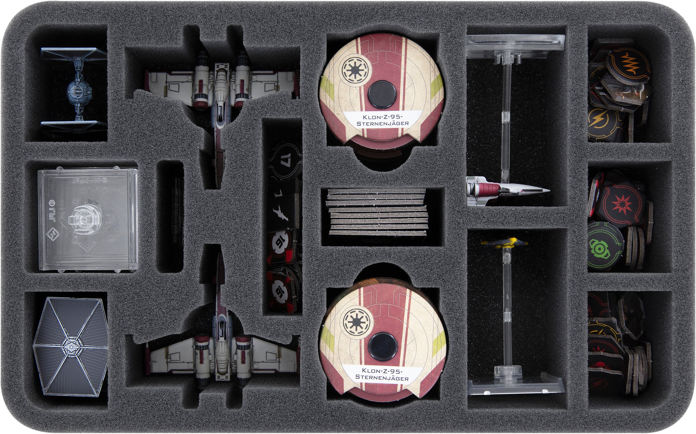 Ta podstawka piankowa Feldherr Half-Size zapewnia niezbędną strefę squash. Dzięki niej Twoje myśliwce są optymalnie chronione nawet przy dużych prędkościach. Oba Clone Z-95 Starfighters otrzymują niestandardowe przedziały. Myśliwce nie będą się przesuwać we wkładce podczas transportu, dzięki niestandardowemu dopasowaniu kroju. Kolory pomalowanych miniatur są zachowane i oszczędzone przed otarciami i zarysowaniami.