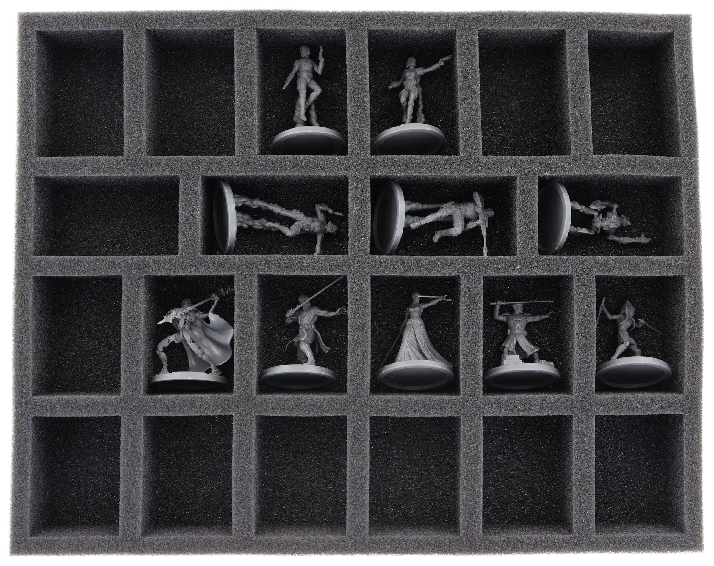 - 2 tace piankowe Full-Size z 22 przegrodami każda, przeznaczone do nieporęcznych miniatur na podstawach 40 mm, takich jak Anakin Skywalker, Asajj Ventress, Battle Droids i modele o podobnych wymiarach (FS050A112).