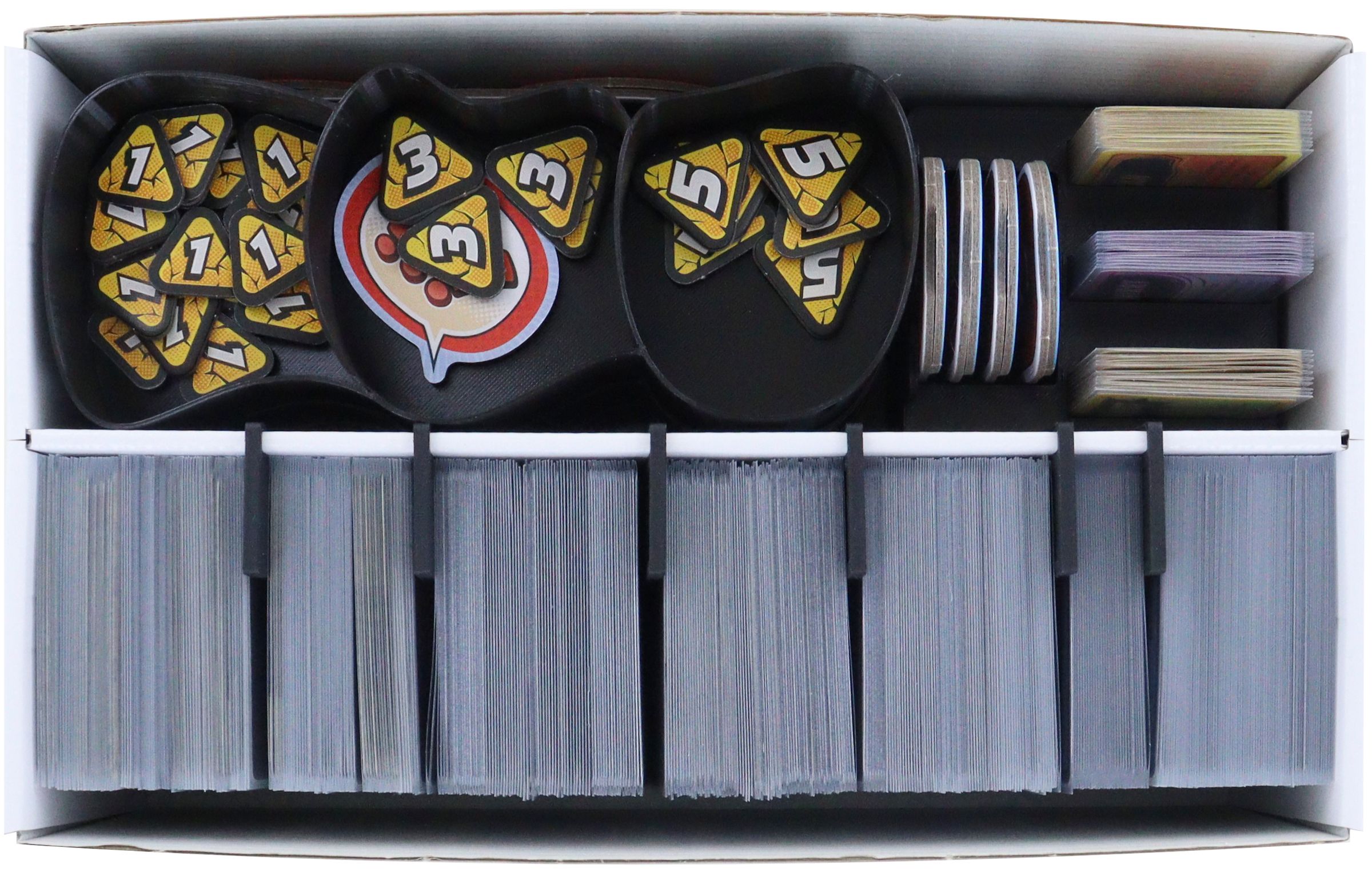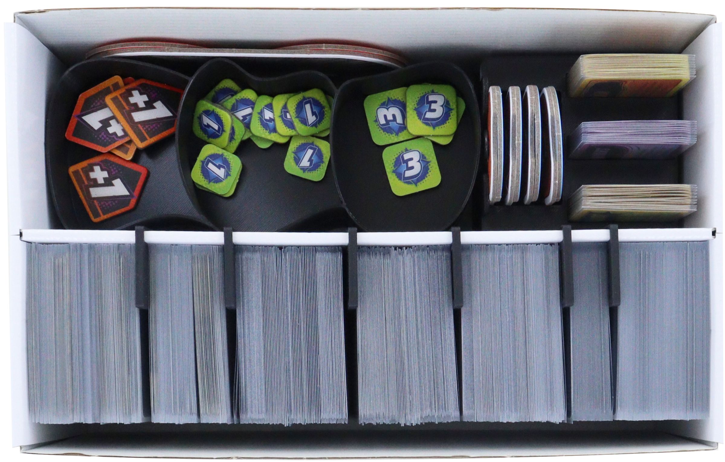 - Pakiet zapewnia dużo miejsca na maksymalnie 2800 zakoszulkowanych kart (5600 niezakoszulkowanych) oraz drobnych komponentów z gry podstawowej.