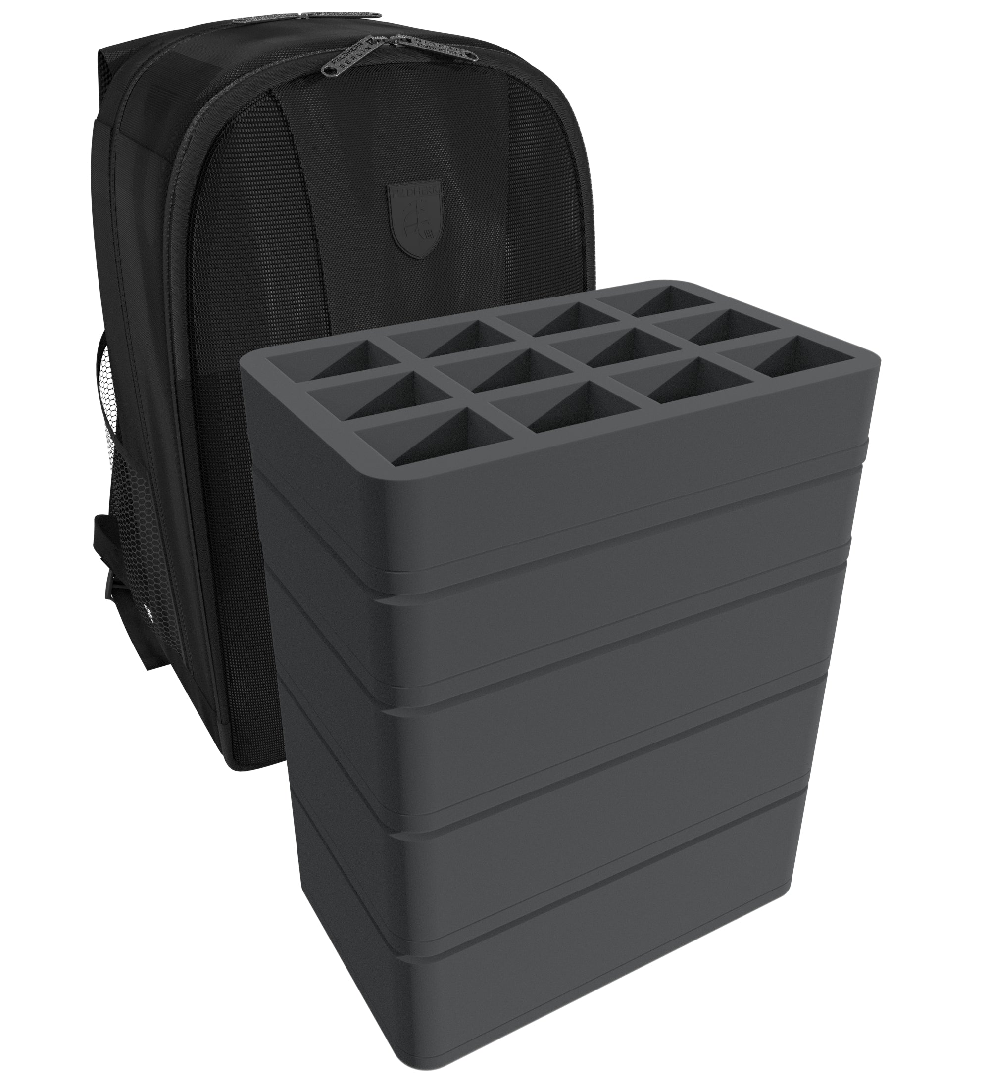 Ten Backpack, wypełniony pasującymi piankowymi tackami Feldherr, mieści do 76 miniatur Twoich załóg + karty i akcesoria do gry.