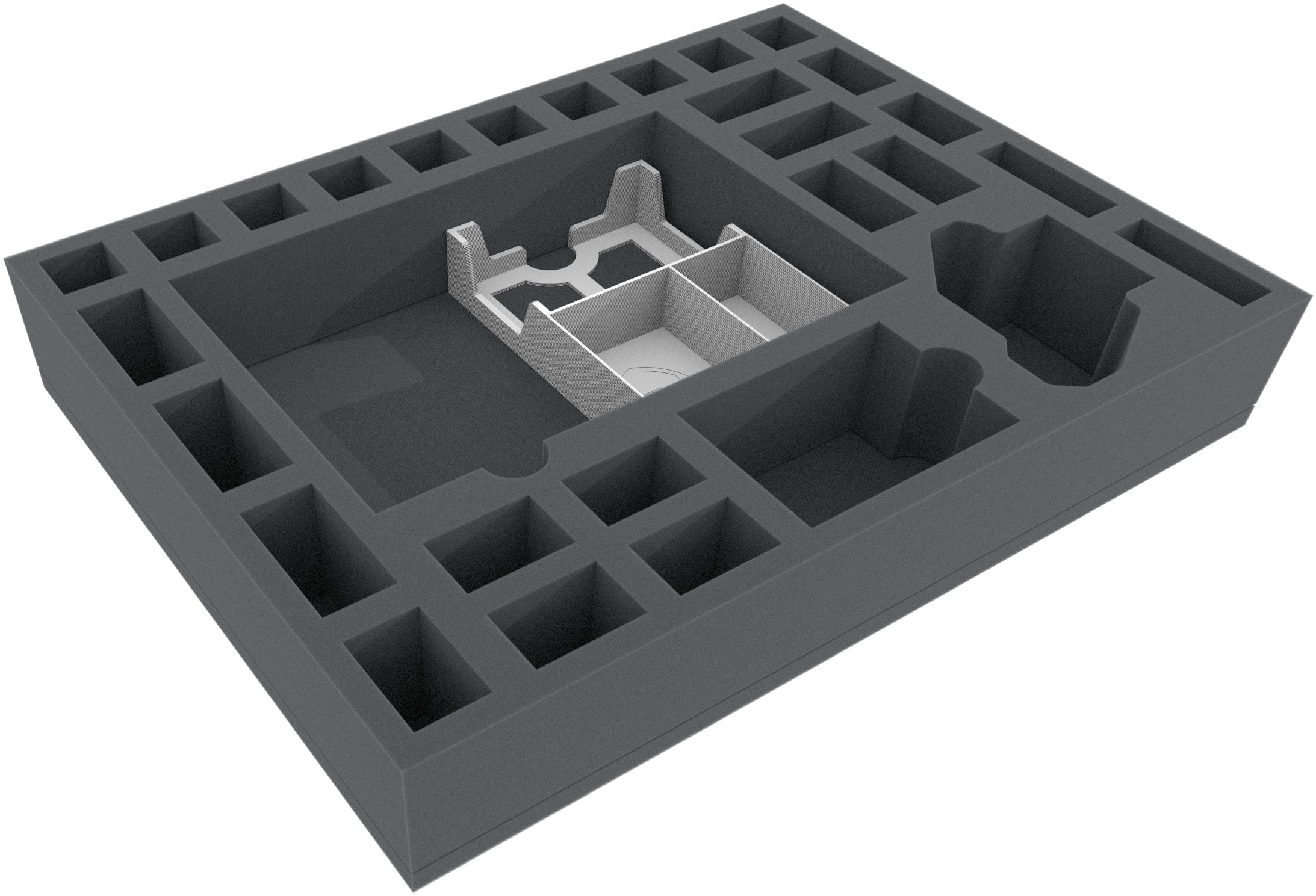- Plastikowy uchwyt na karty pasuje do piankowej tacki. Oferuje miejsce na 35 kart gry i małe materiały do gry z rozszerzenia. 21 figurek i dwoje drzwi znajduje optymalną ochronę w pozostałych przegródkach piankowej tacki.