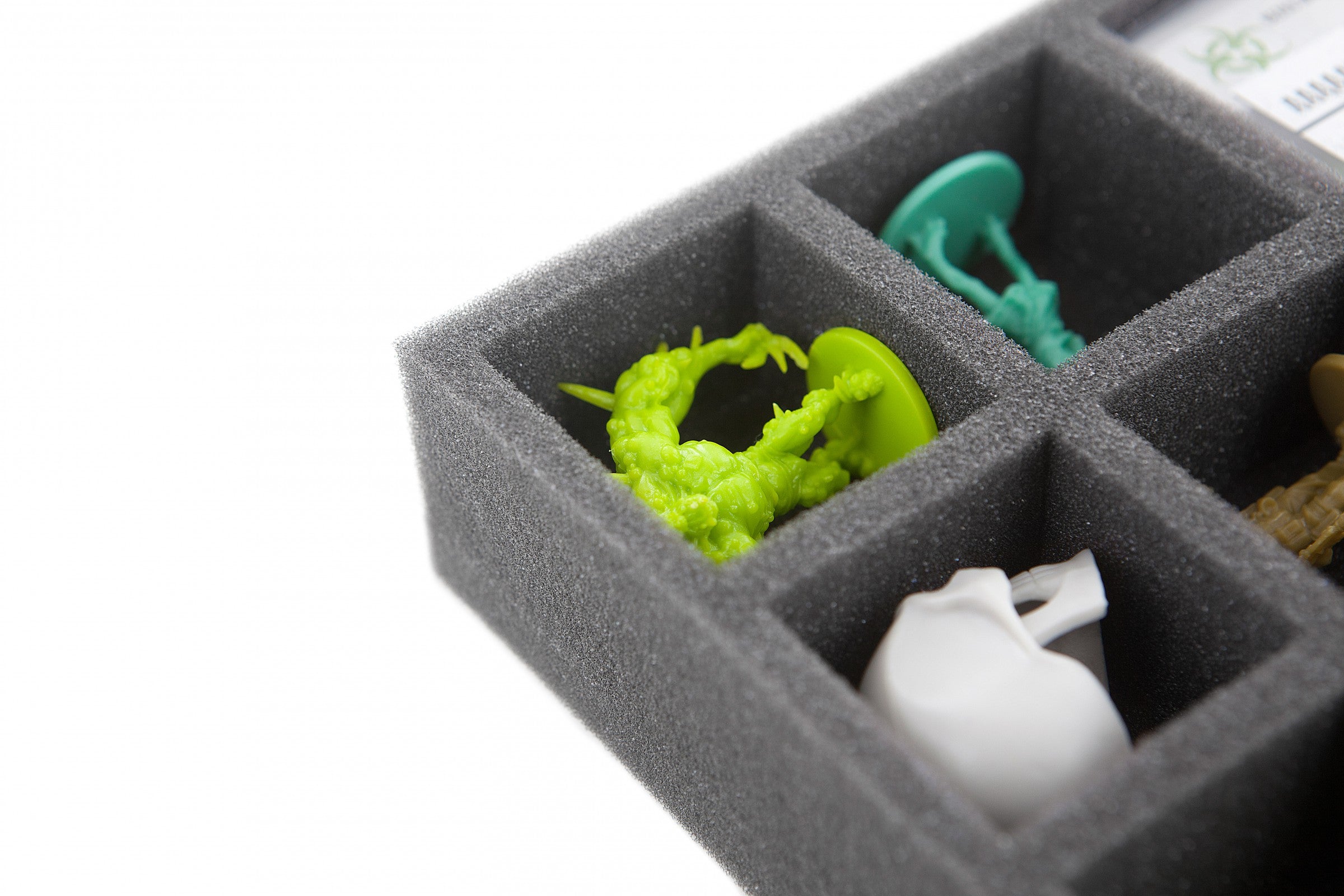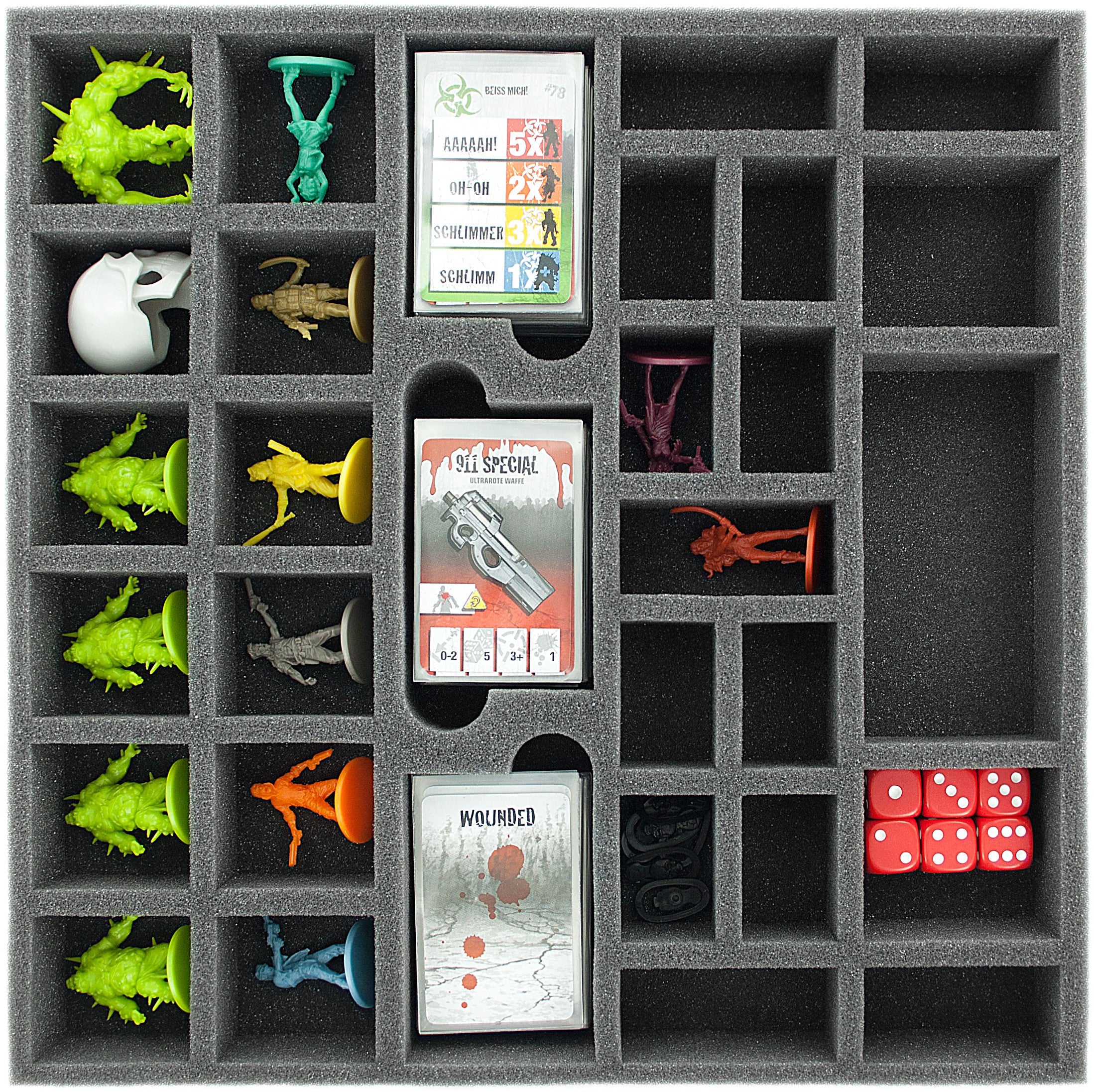 - 3 gniazda na karty Mini w rękawach (karty Zombie, karty wyposażenia i karty rannych) - rozmiar przegrody 78 mm x 52 mm x 31 mm wysokości