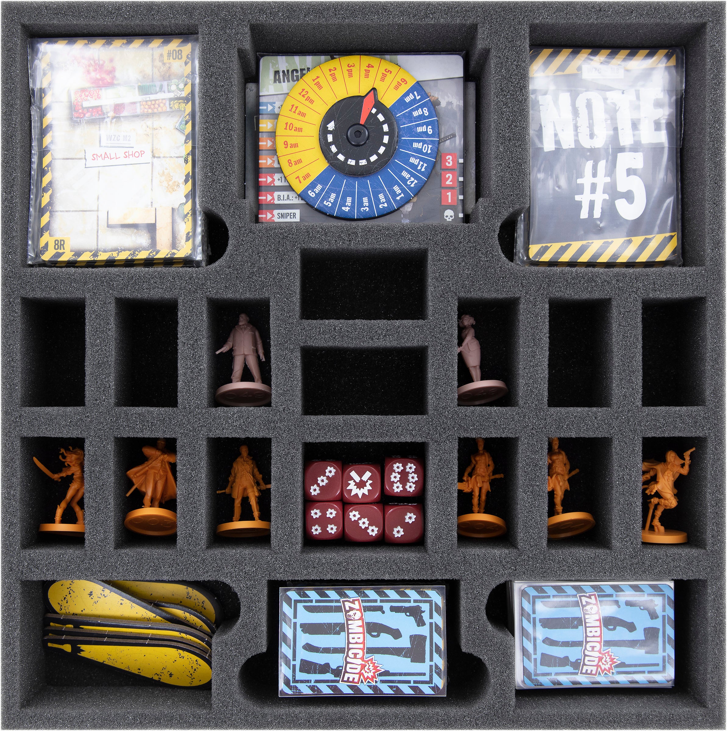 This foam tray is divided into 21 compartments to stowe your miniatures. It fits exactly into the original Zombicide board game boxes.