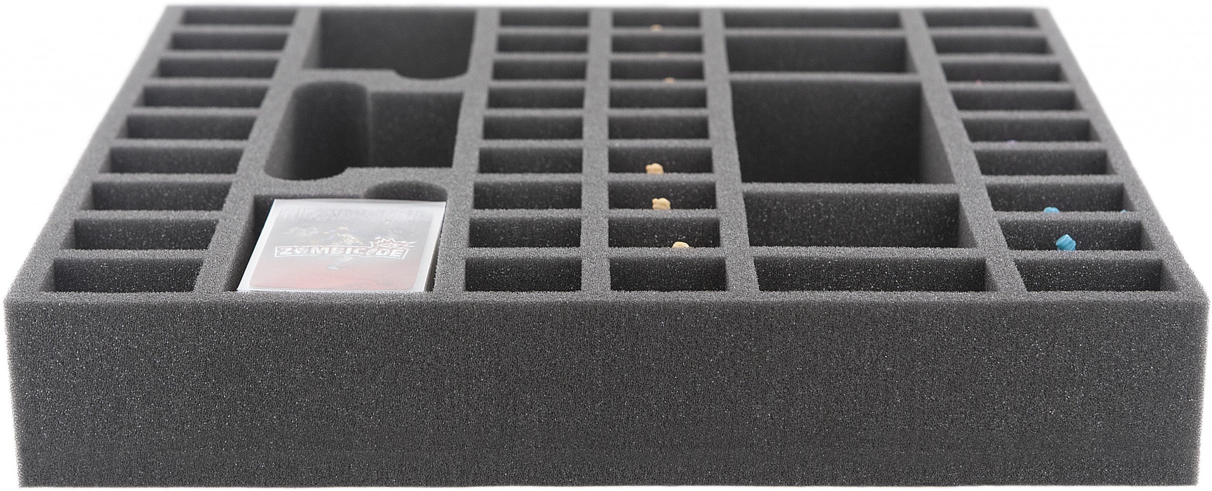 - 3 gniazda na karty Mini w rękawach (karty Zombie, karty wyposażenia i karty rannych) - rozmiar przegrody 78 mm x 52 mm x 40 mm wysokości