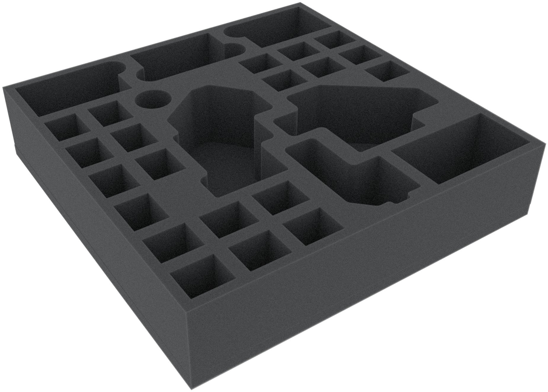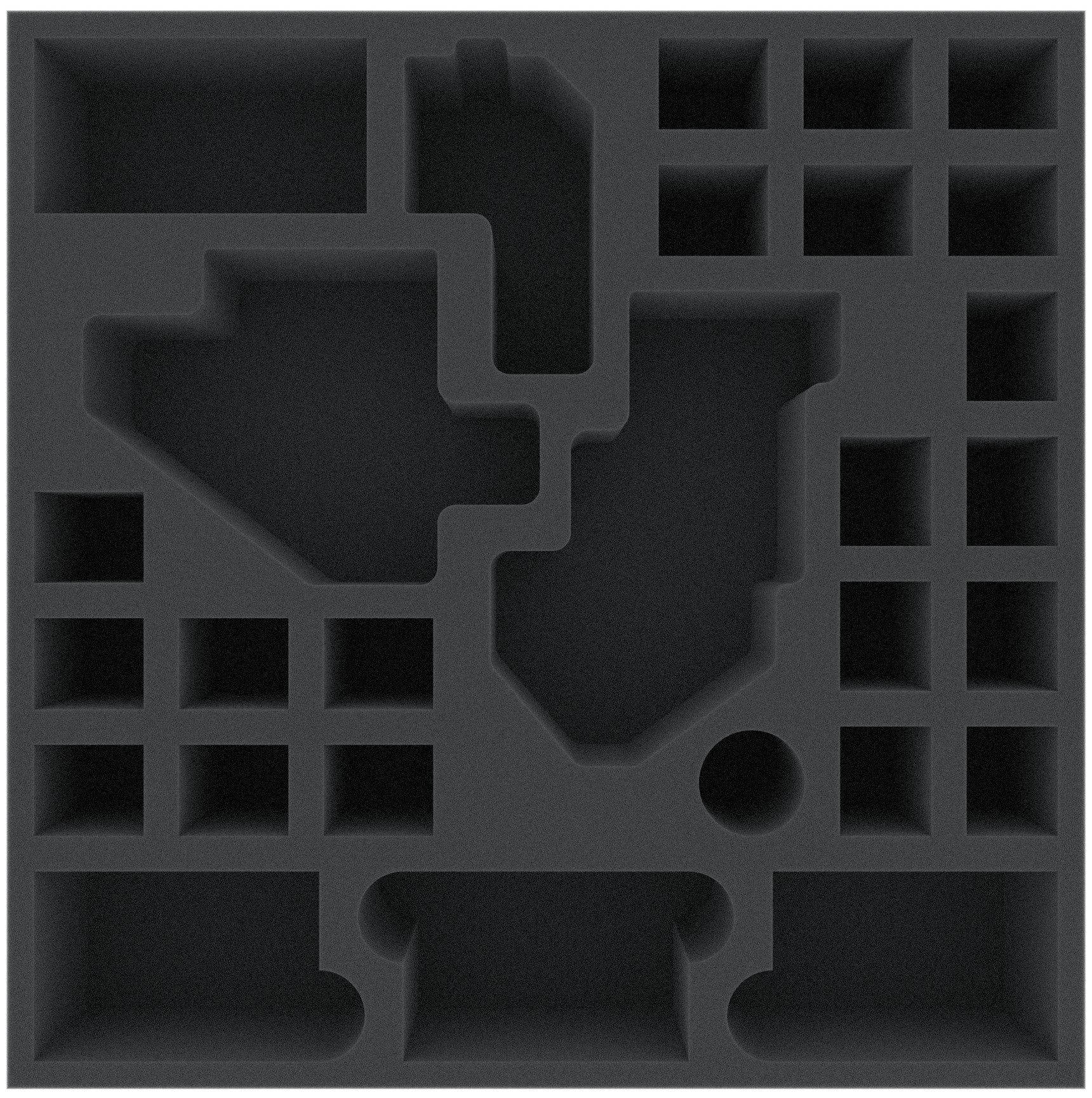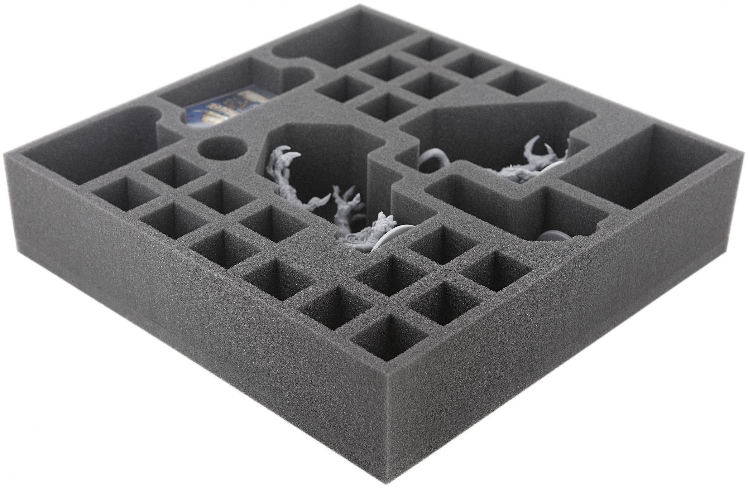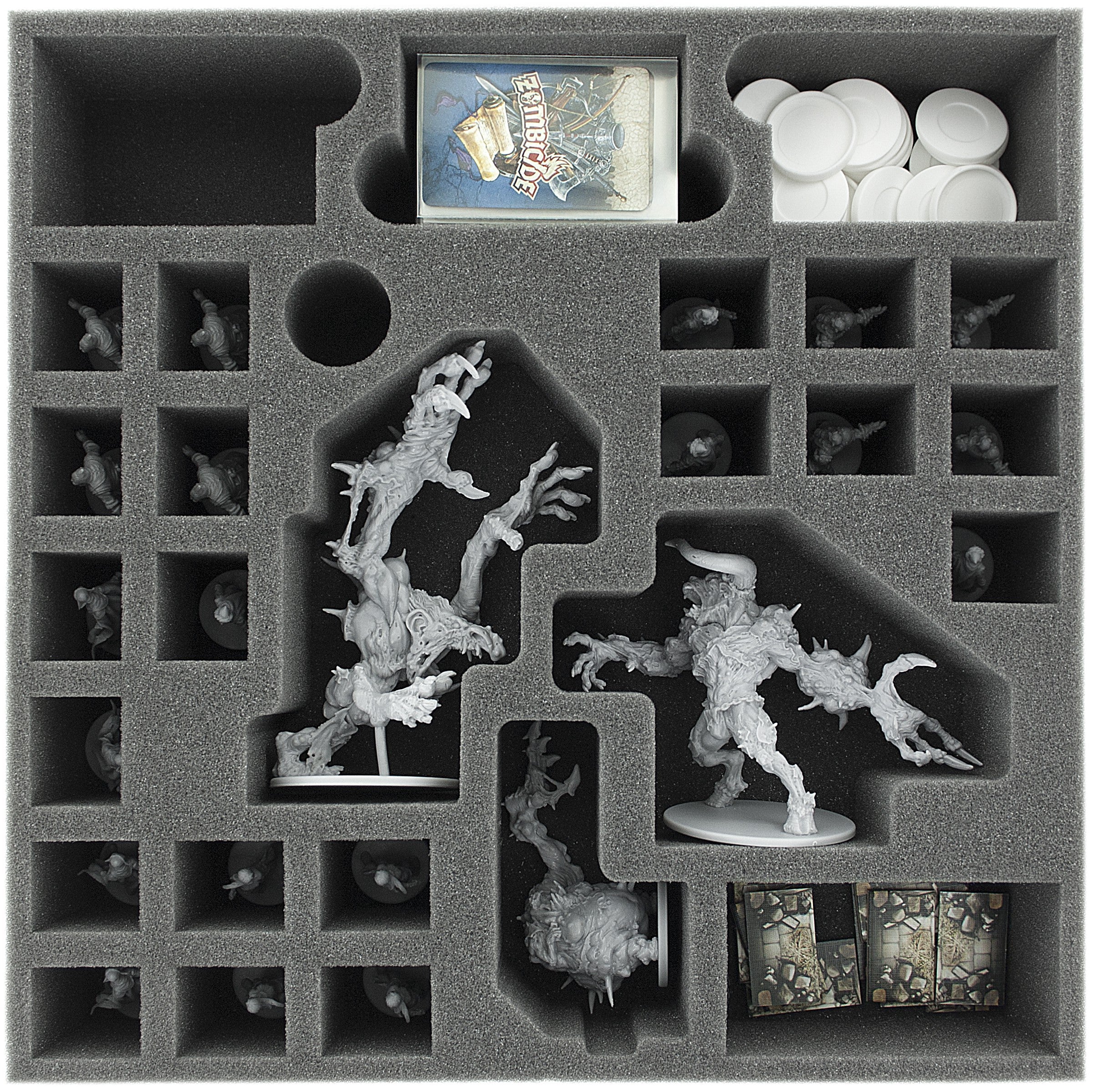 Foam tray especially for Zombicide Bosses and NPCs. The 28 different sized compartments are perfect for miniatures from the both expansions. So 20 Walkers, a Ablobination, a Abbominatroll, a Abominotaur, mini cards in sleeves and markers can be kept in a well.