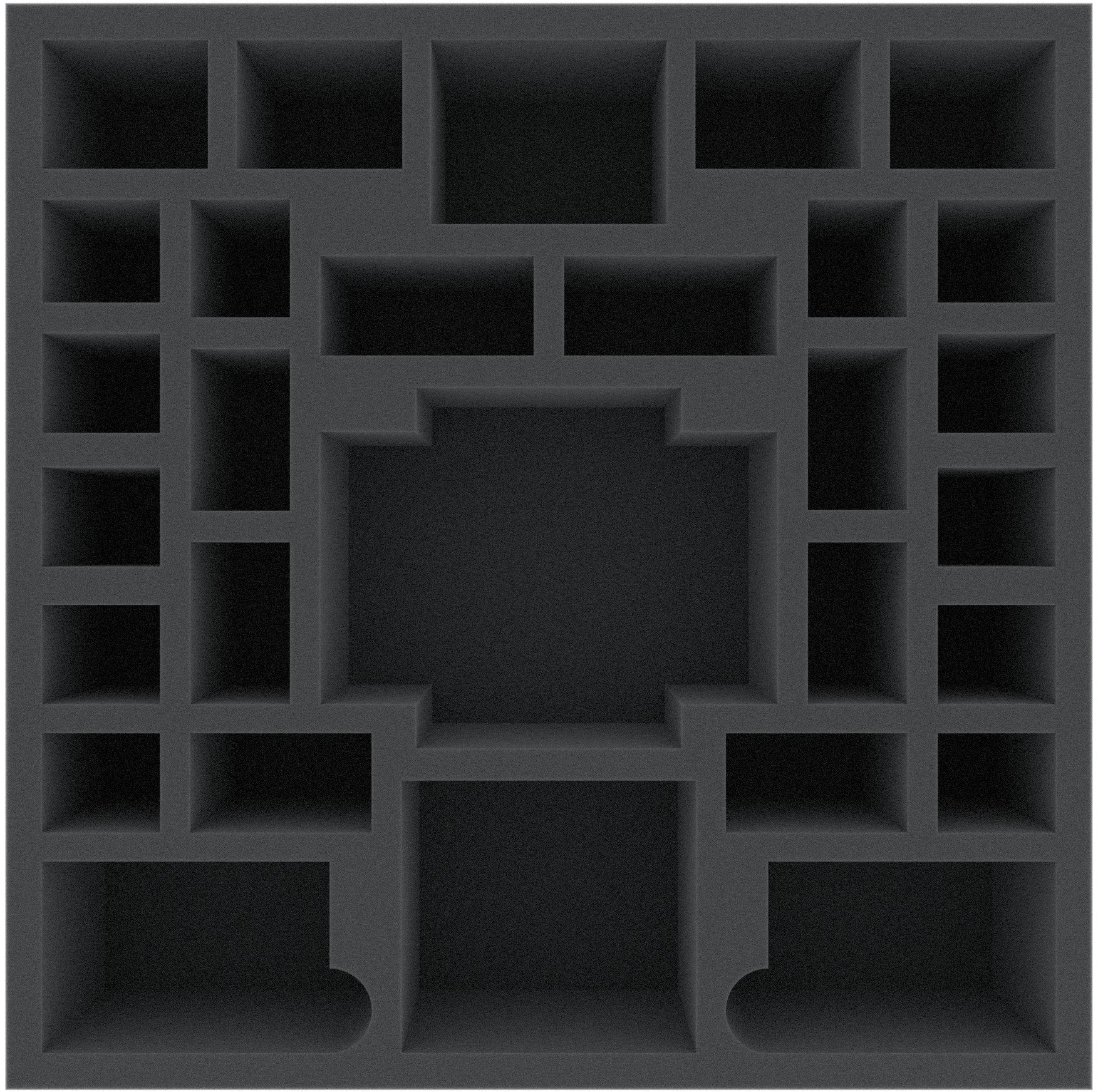 Our foam tray for Mythic Battles: Pantheon allows you to store all miniatures of the Trojan Wars, Keto, Oedipus vs The Sphinx and the Corinthia expansions. The foam tray features 29 custom-cut compartments which safely accommodate the 27 miniatures from the four expansions. In the additional 2 compartments, further game components like Stat Clips can be stored.