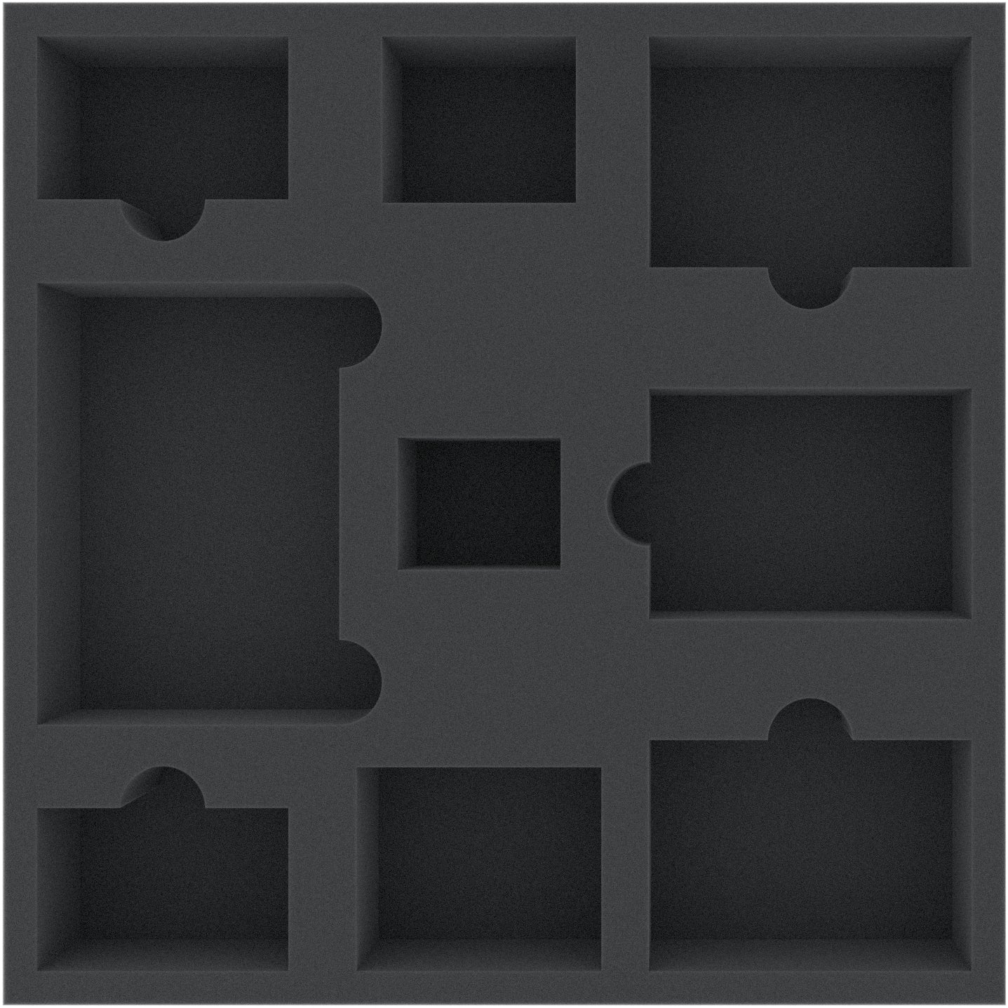 This 50 mm mm high foam tray is divided into 9 compartments. It is particularly suitable for the safe storage of tabletop and board game miniatures, as well as other fragile models and small parts.