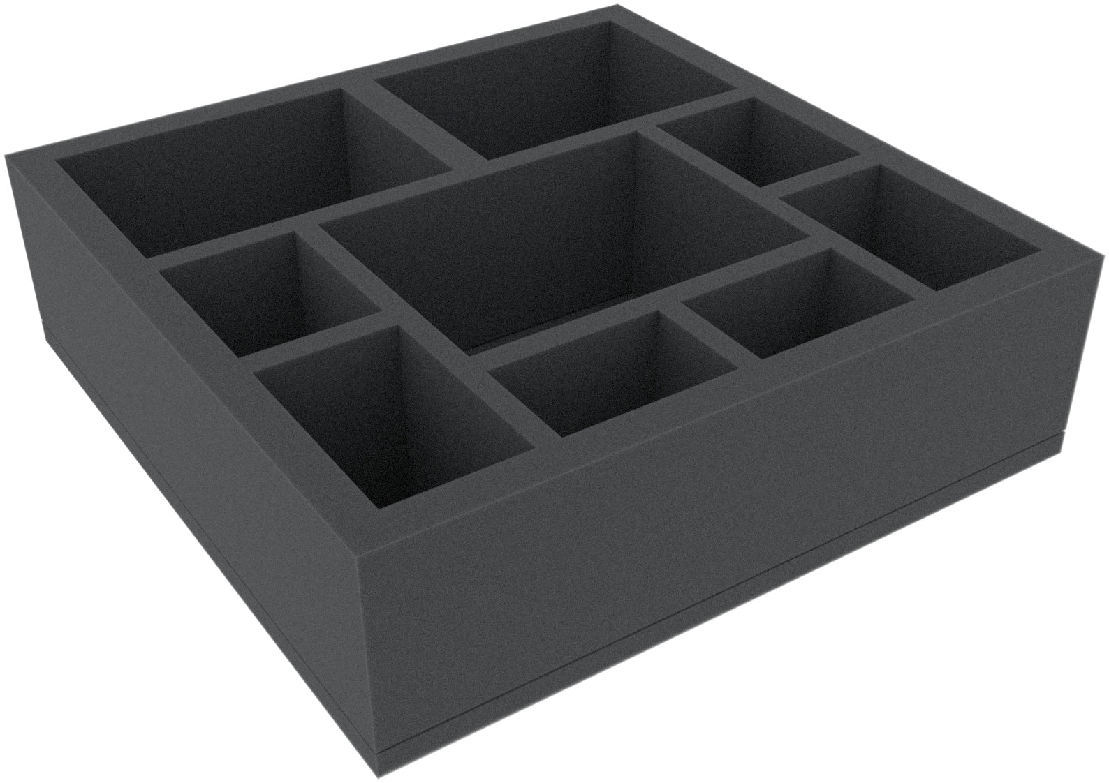 This 85 mm high foam tray is divided into 9 compartments. It is particularly suitable for the safe storage of tabletop and board game miniatures, as well as other fragile models and small parts.