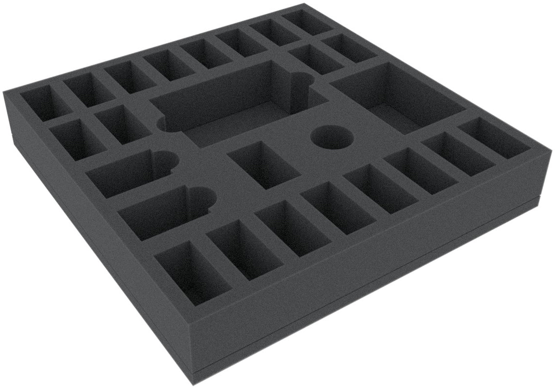This 50 mm mm high foam tray is divided into 26 compartments. It is particularly suitable for the safe storage of tabletop and board game miniatures, as well as other fragile models and small parts.