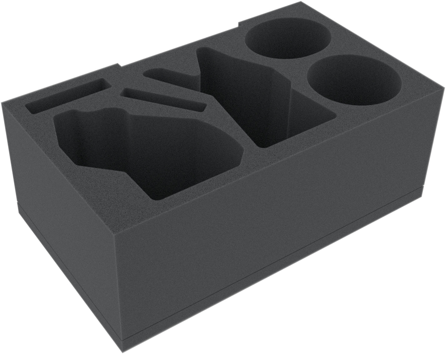 The Feldherr foam tray has the dimensions: 238 mm x 140 mm x 90 mm height. The 90 mm depth of the foam is result from 10 mm foam base and slot foam tray with 80 mm effective depth.