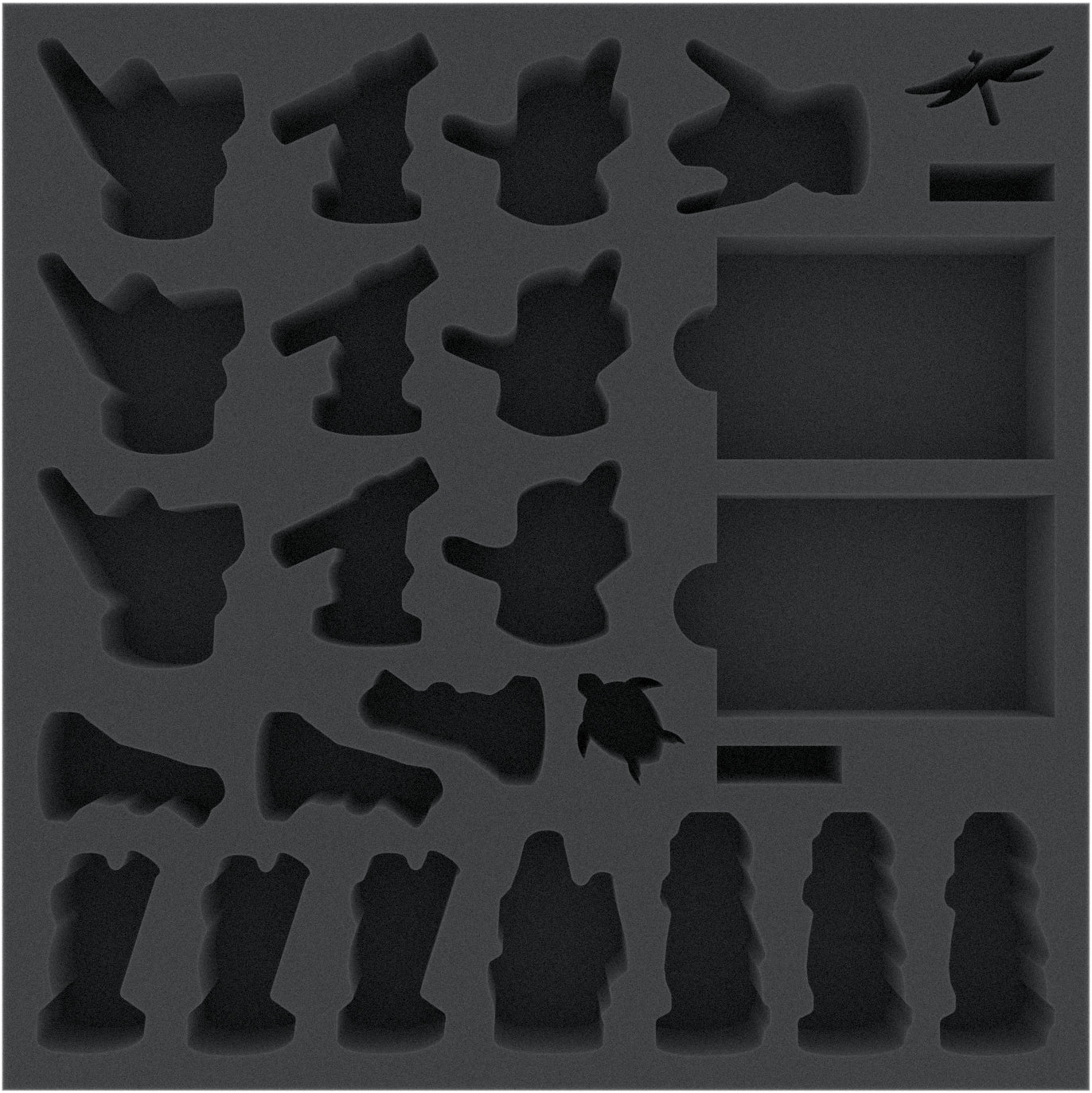 The foam tray for Turtle and Dragonfly Clan has compartments for: