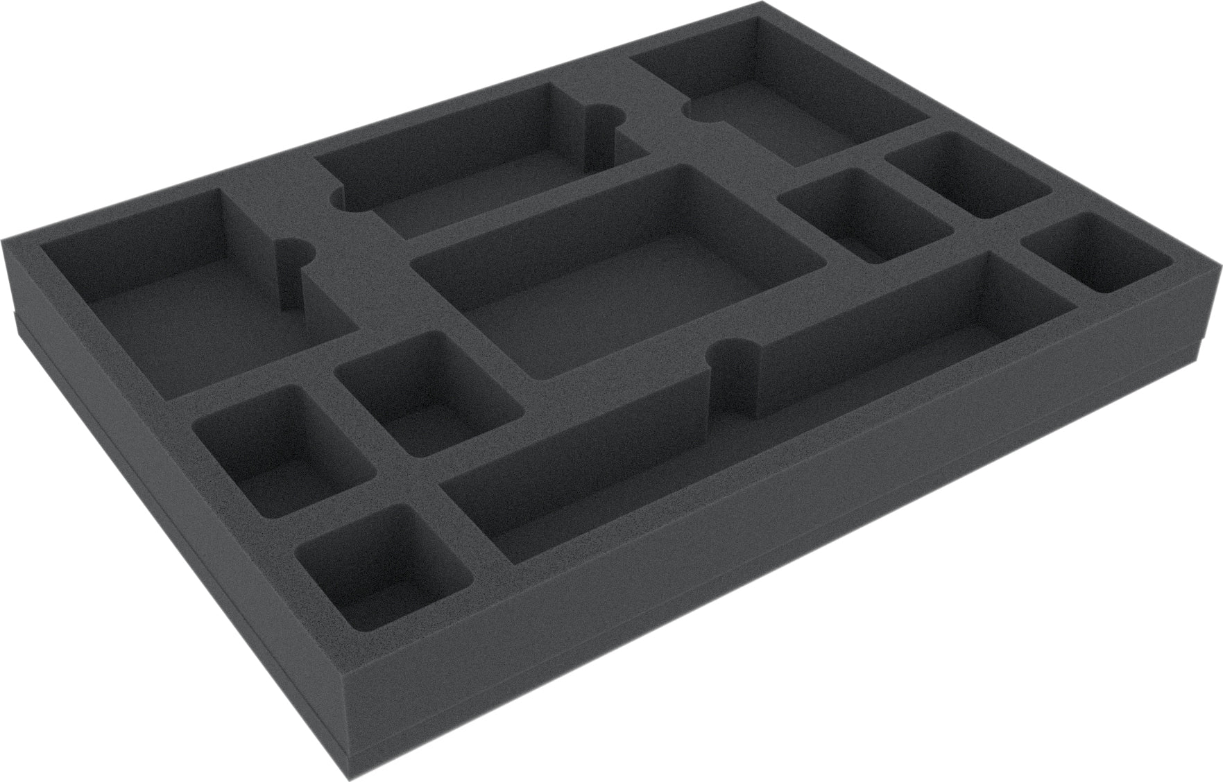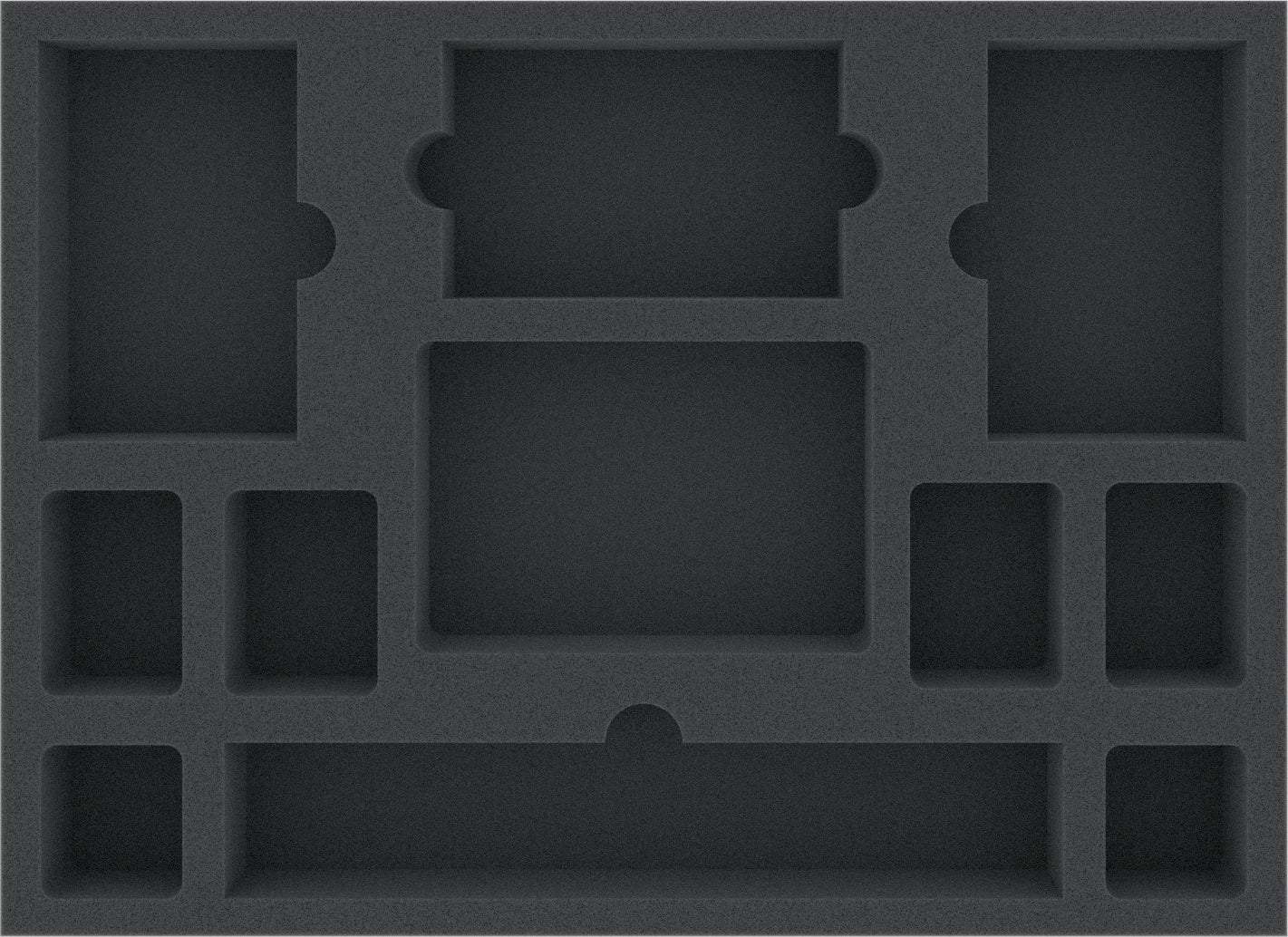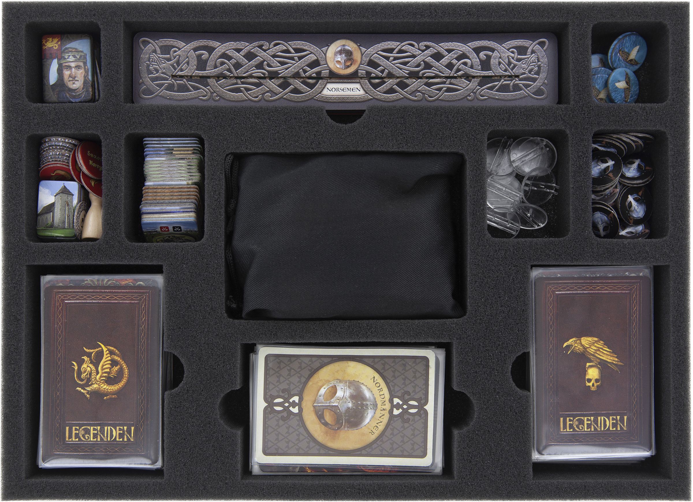 This foam tray offers space for the game material (excluding miniatures) of the 878 Vikings base game and the Age of the Vikings Expansion. Cards, Tokens, Dice etc. can thus be stored safely in the 11 custom-cut compartments. The foam tray fits exactly into the Original board game box
