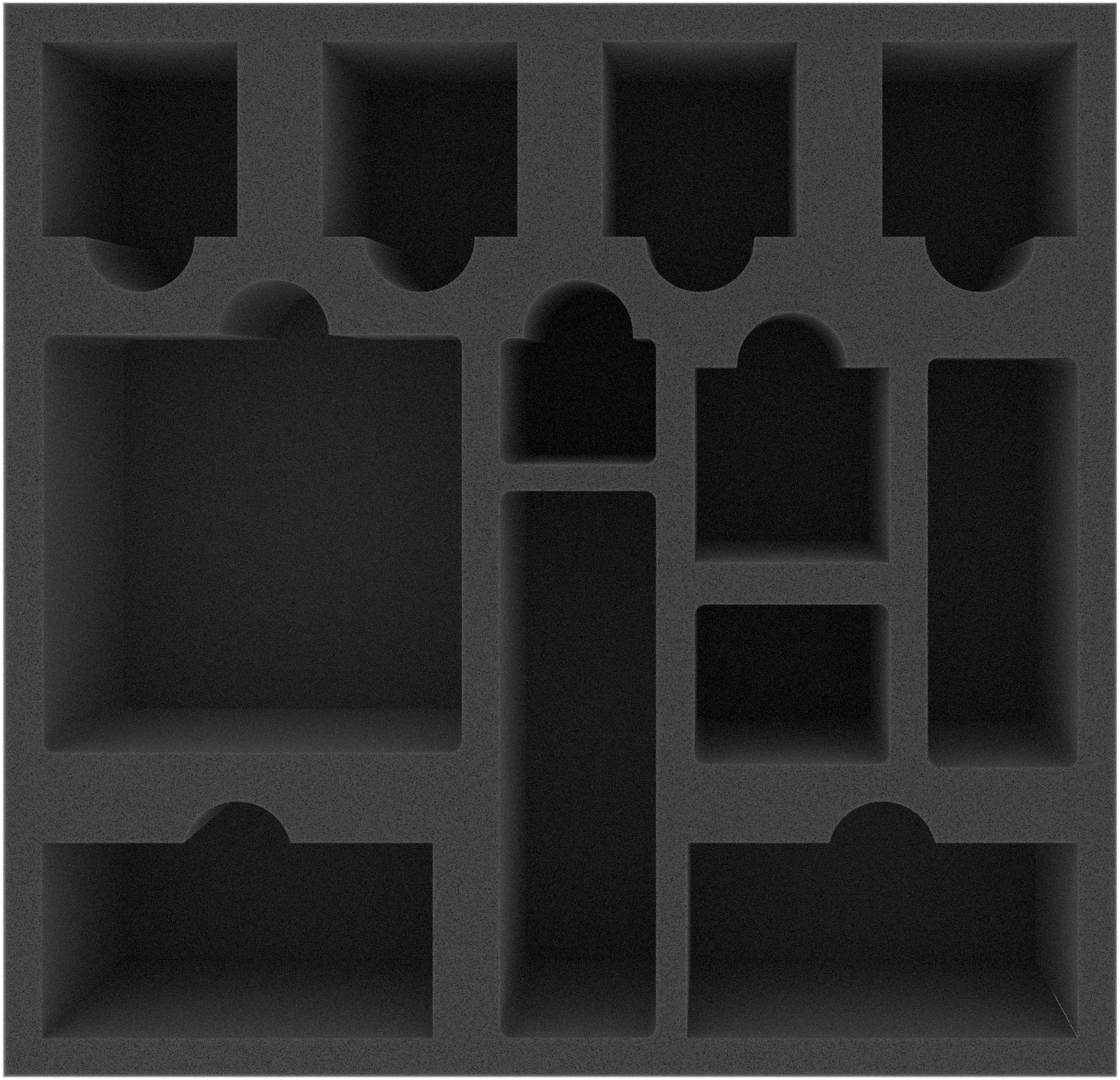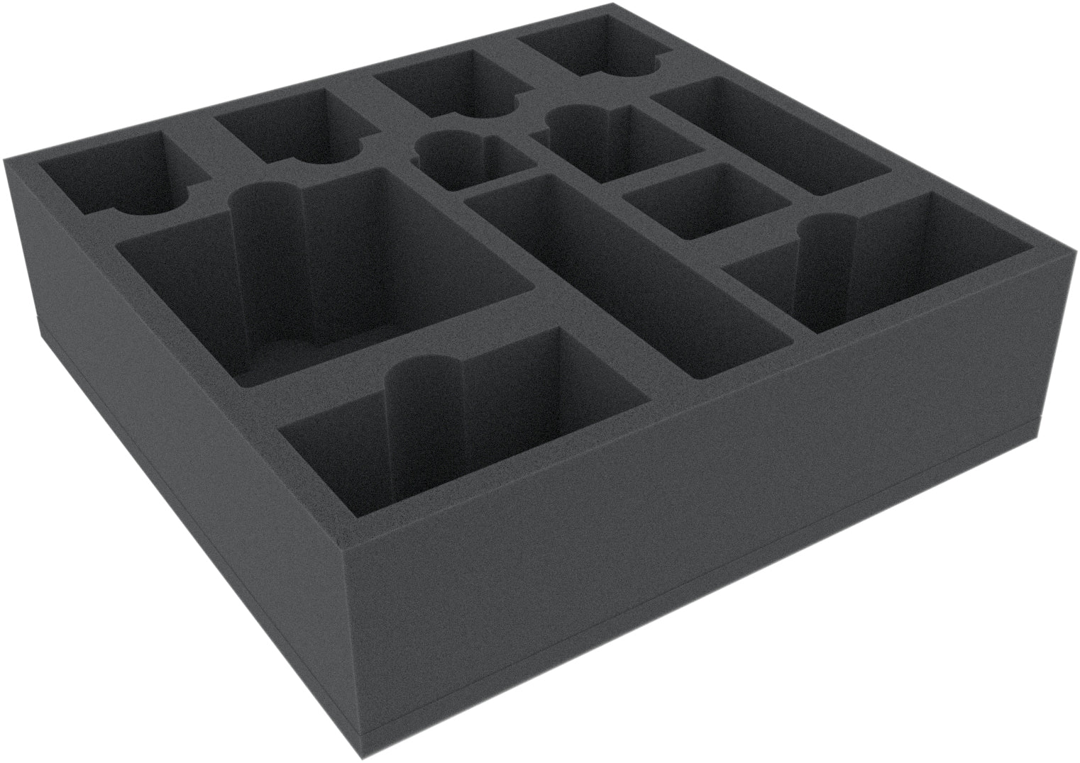 This custom foam insert for the Gloomhaven game box has 12 compartments for game material of the popular Cephalofair board game.