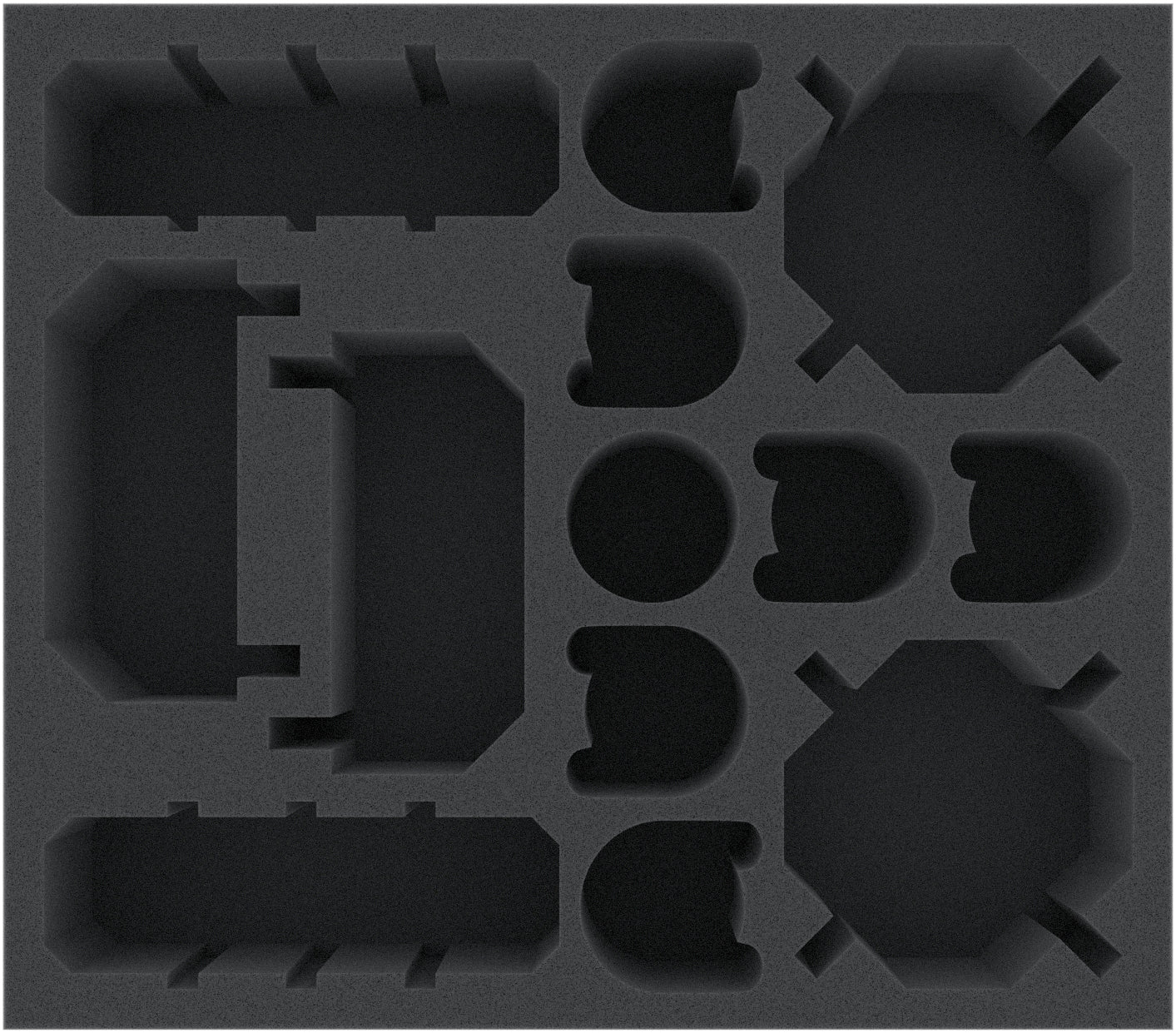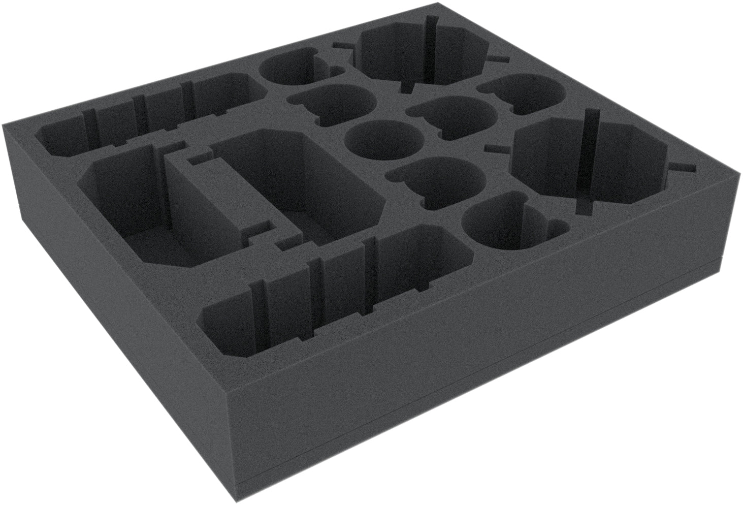 Foam tray with 13 compartments to clearly and safely store 6 Questoris Knights and the building parts. Suitable for the original Adeptus Titanicus: Grandmaster Edition board game box.