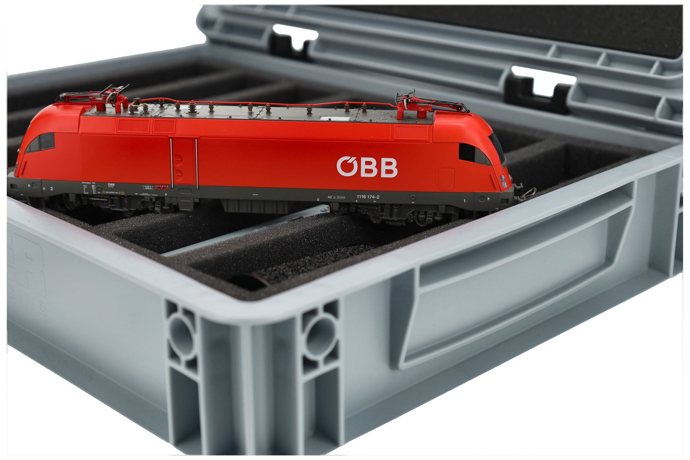 For anyone who wants to transport their H0 scale locomotives, wagons and vehicles safely and compactly: this Feldherr set combines a stackable Eurobox with a custom-fit foam insert. Whether for trips to the model railroad club, module meetings, or as a space-saving storage solution at home, your models are well protected at all times.