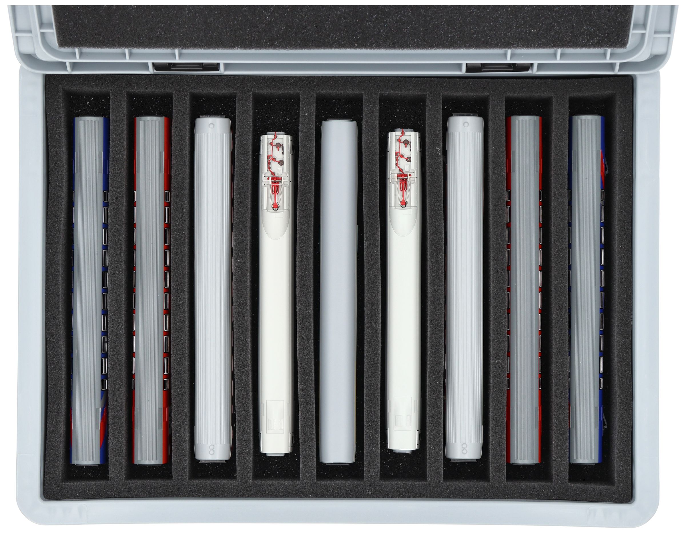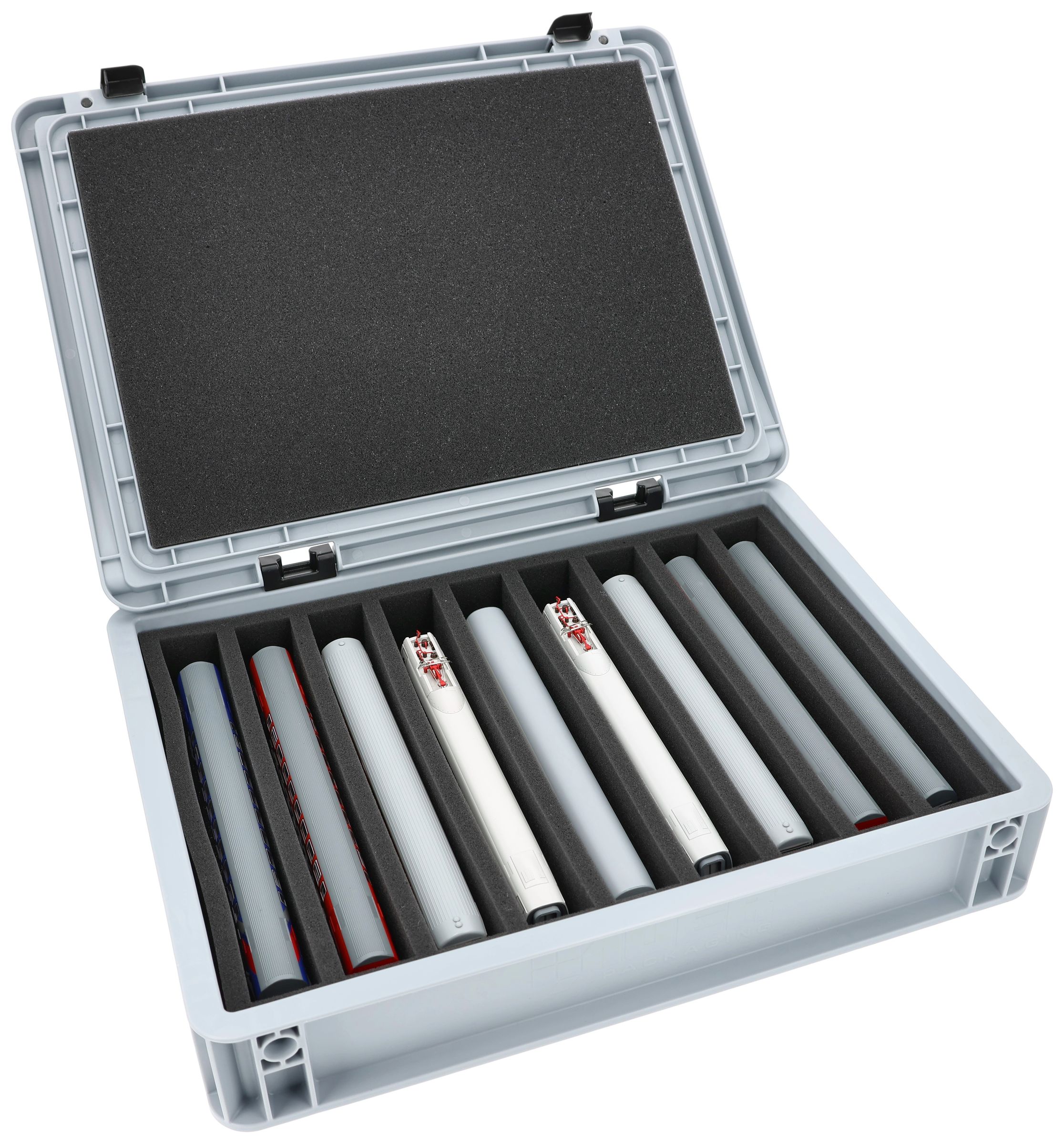 Die 9 gleich großen Fächer (je ca. 250 mm lang x 30 mm breit x 40 mm tief) sind speziell für Modelle der Spur TT ausgelegt. Je nach Länge passen mehrere Waggons oder Lokomotiven nebeneinander. Die exakte Passform sorgt dafür, dass die Modelle sicher fixiert sind und beim Transport nicht verrutschen.