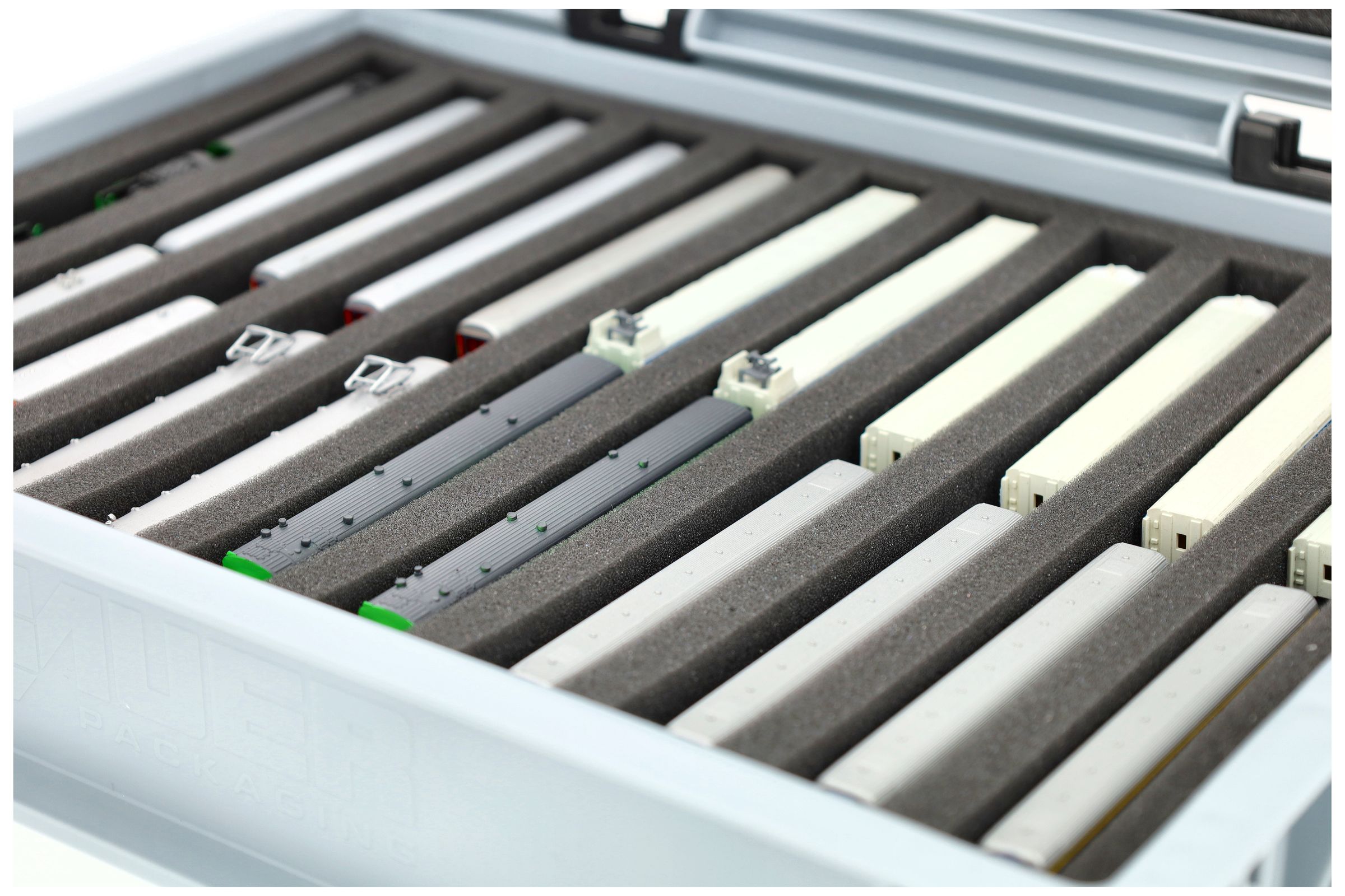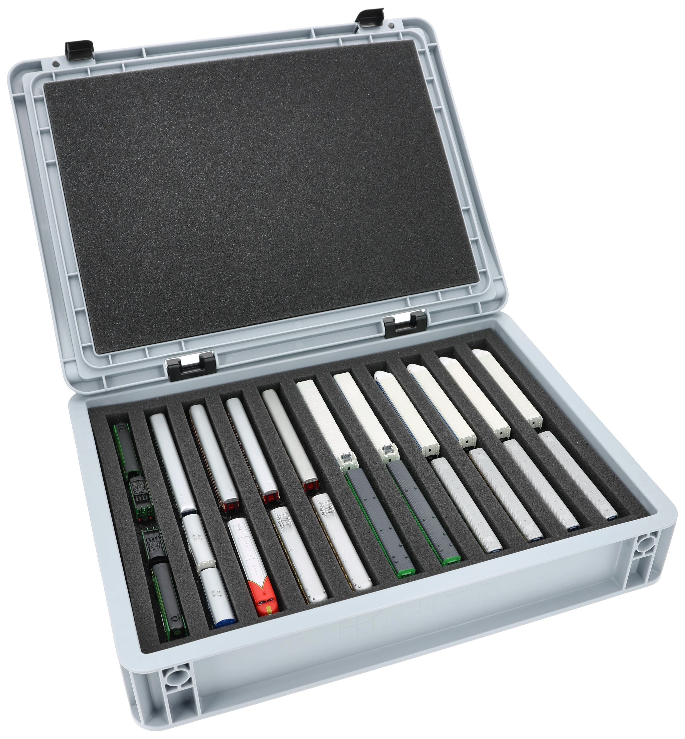 The 11 equal-sized compartments (each approx. 245 x 20 x 20 mm) are specially designed for Z scale models. Depending on their length, several wagons or locomotives can be placed side by side. The exact fit ensures that the models are securely fixed and do not slip during transport.