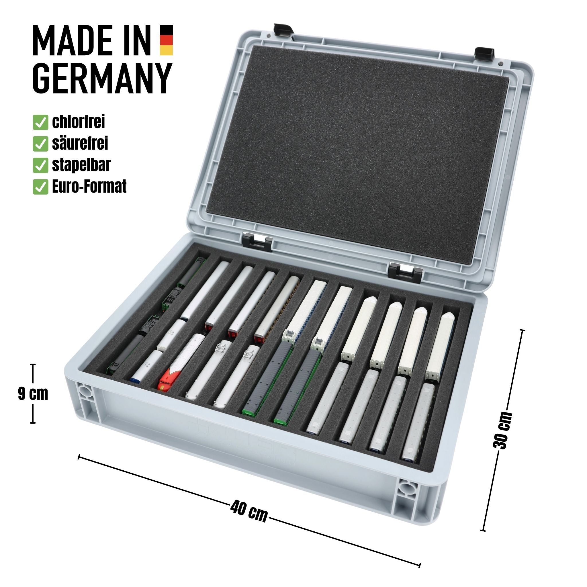 For anyone who wants to transport their Z scale locomotives, wagons and vehicles safely and compactly: this Feldherr set combines a stackable Eurobox with a custom-fit foam insert. Whether for trips to the model railroad club, module meetings, or as a space-saving storage solution at home - your models are well protected at all times.