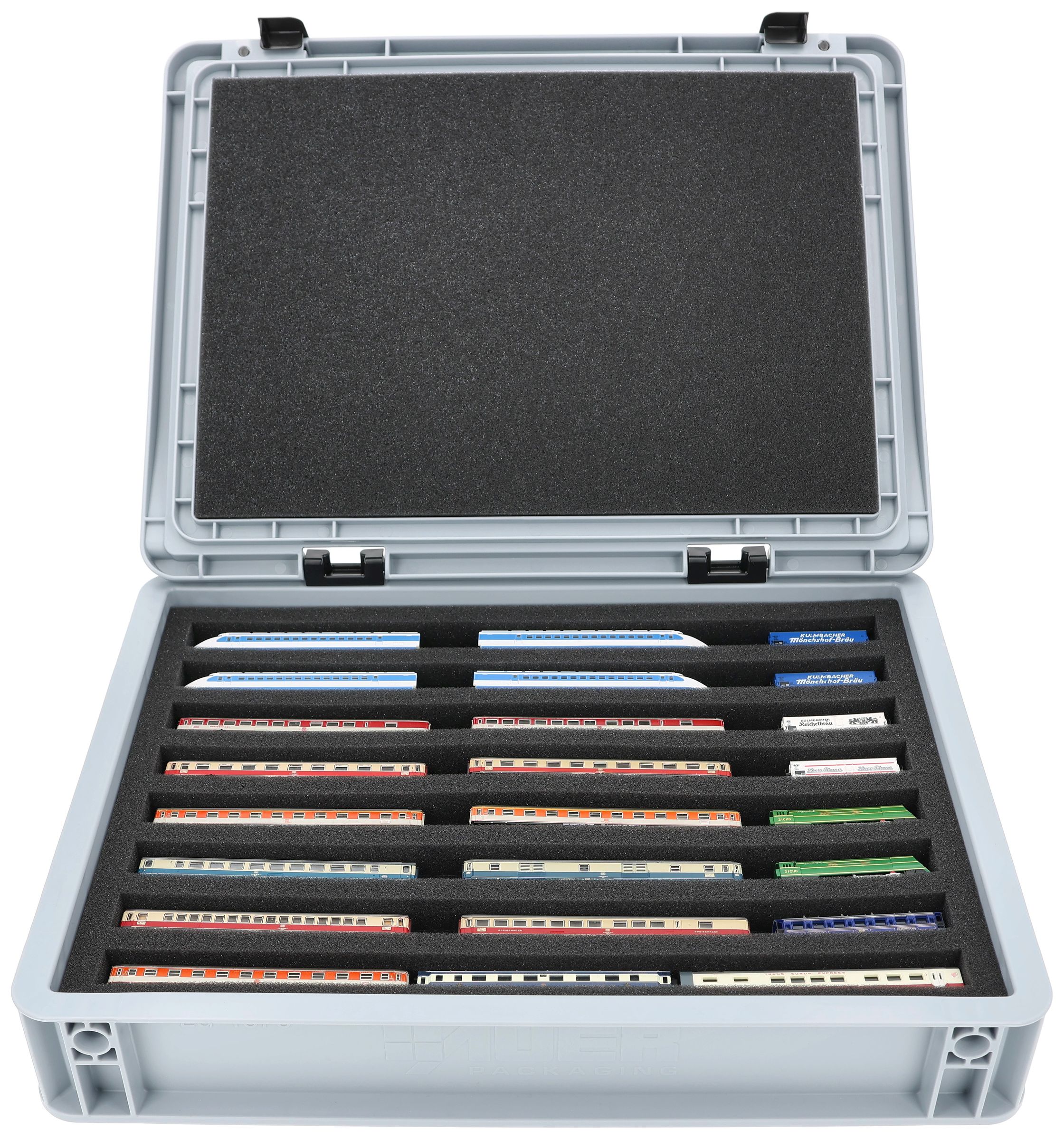 For anyone who wants to transport their Z scale locomotives, wagons and vehicles safely and compactly: this Feldherr set combines a stackable Eurobox with a custom-fit foam insert. Whether for trips to the model railroad club, module meetings, or as a space-saving storage solution at home - your models are well protected at all times.