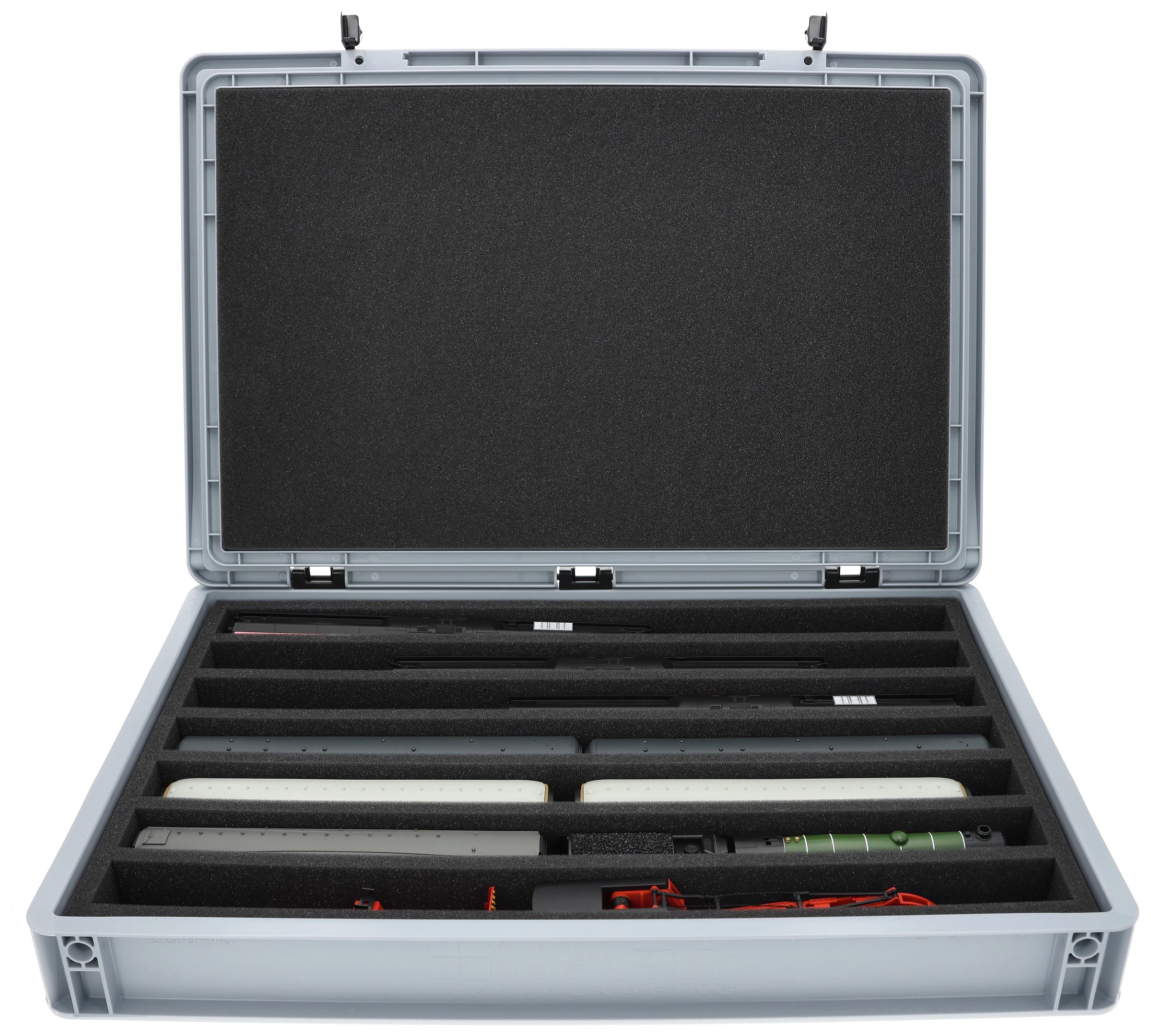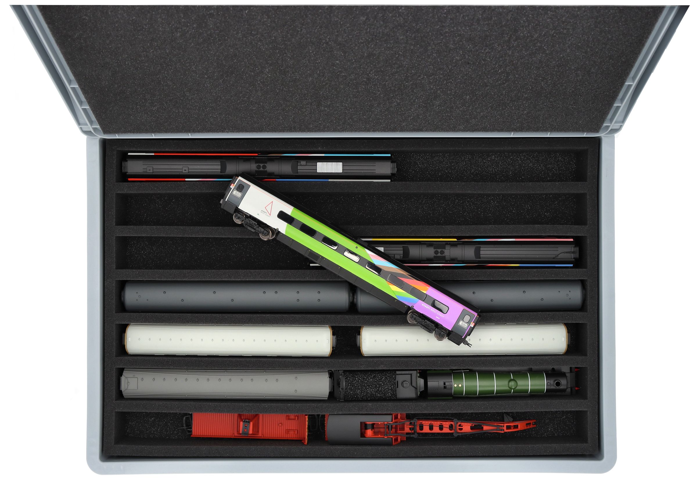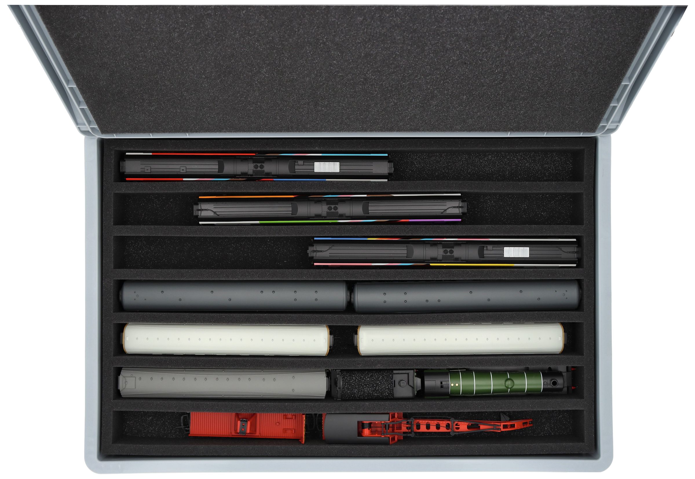 The 7 equal-sized compartments (each approx. 536 x 38 x 55 mm) are specially designed for 00 scale models. Depending on their length, several wagons or locomotives can be placed side by side. The exact fit ensures that the models are securely fixed and do not slip during transport.