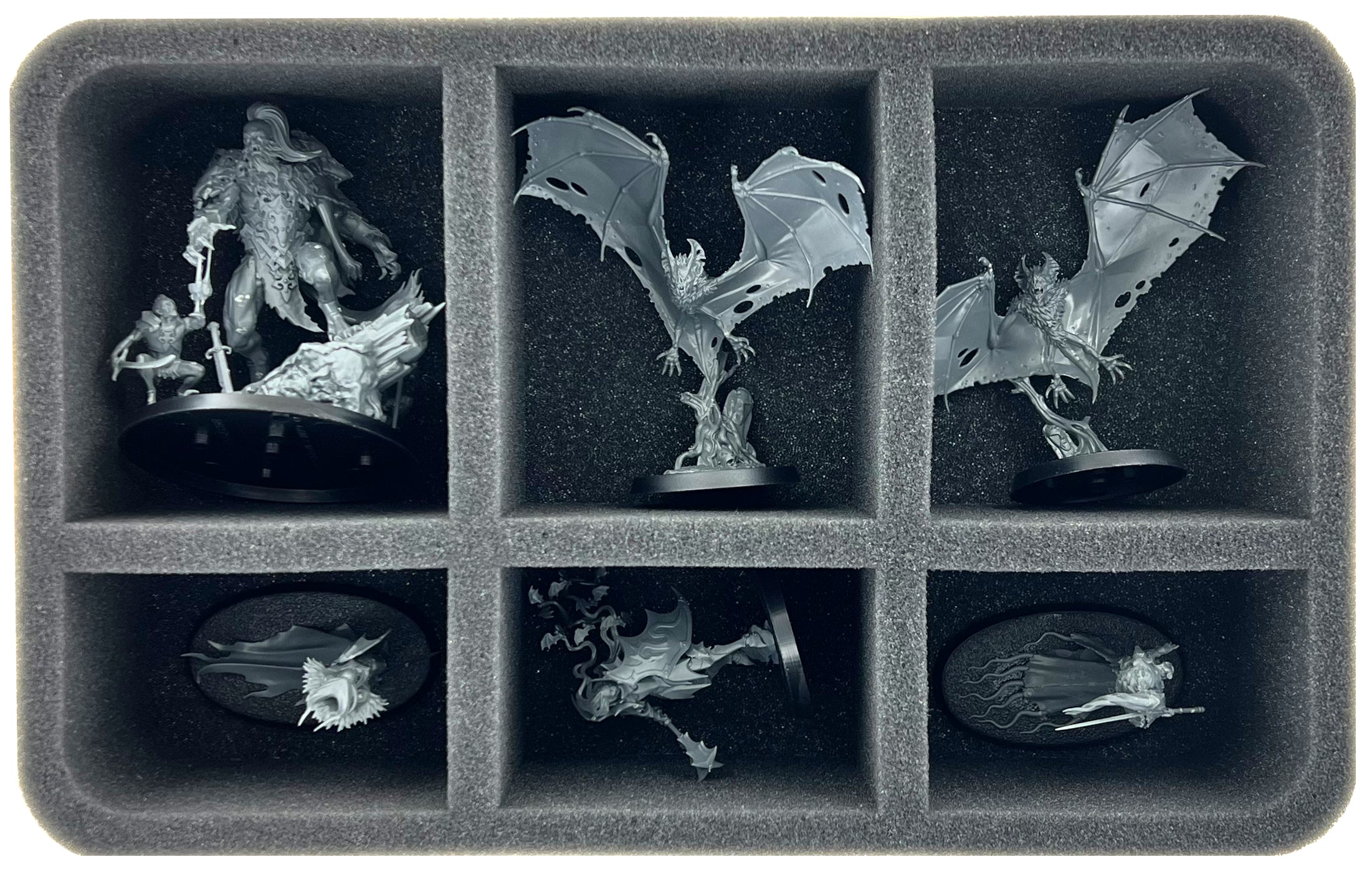 • 1 Half-Size foam tray with six compartments for miniatures like Radukar the Beast, Lady Annika, Kritza, Carmilla DuSang, and Fell Bats