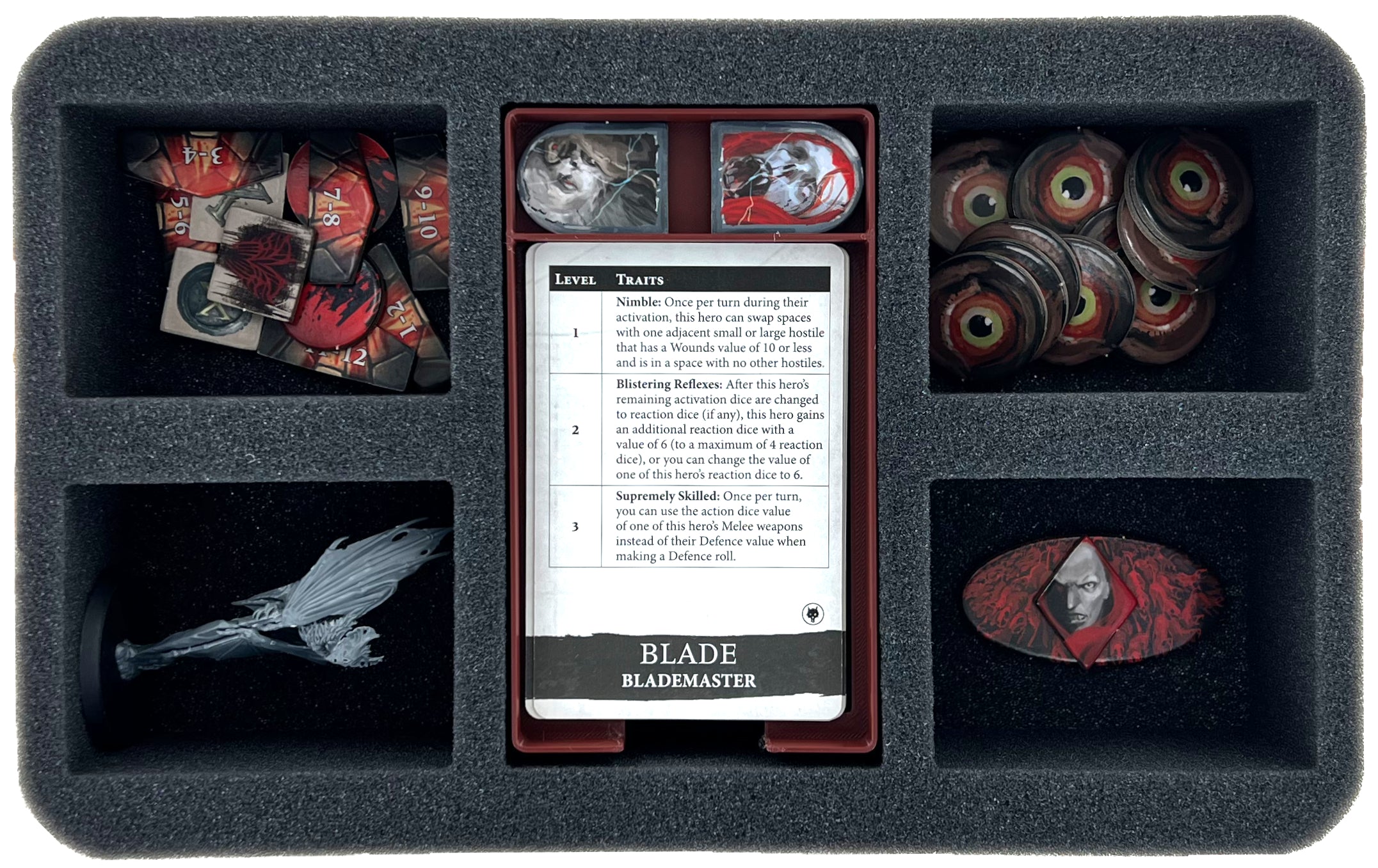 • 1 Half-Size foam tray with five compartments for small-sized game material like Blood Points, Lurk Tokens (Hostile Groups, Mysterious Objects, Familiars), Hunted Tokens, Abhorrent Swarm Tokens, Numbered Lychgates, Twisted Sigil Tokens, Amulet Right Half Token, Runelock Token + a miniature like fell bats + card holder