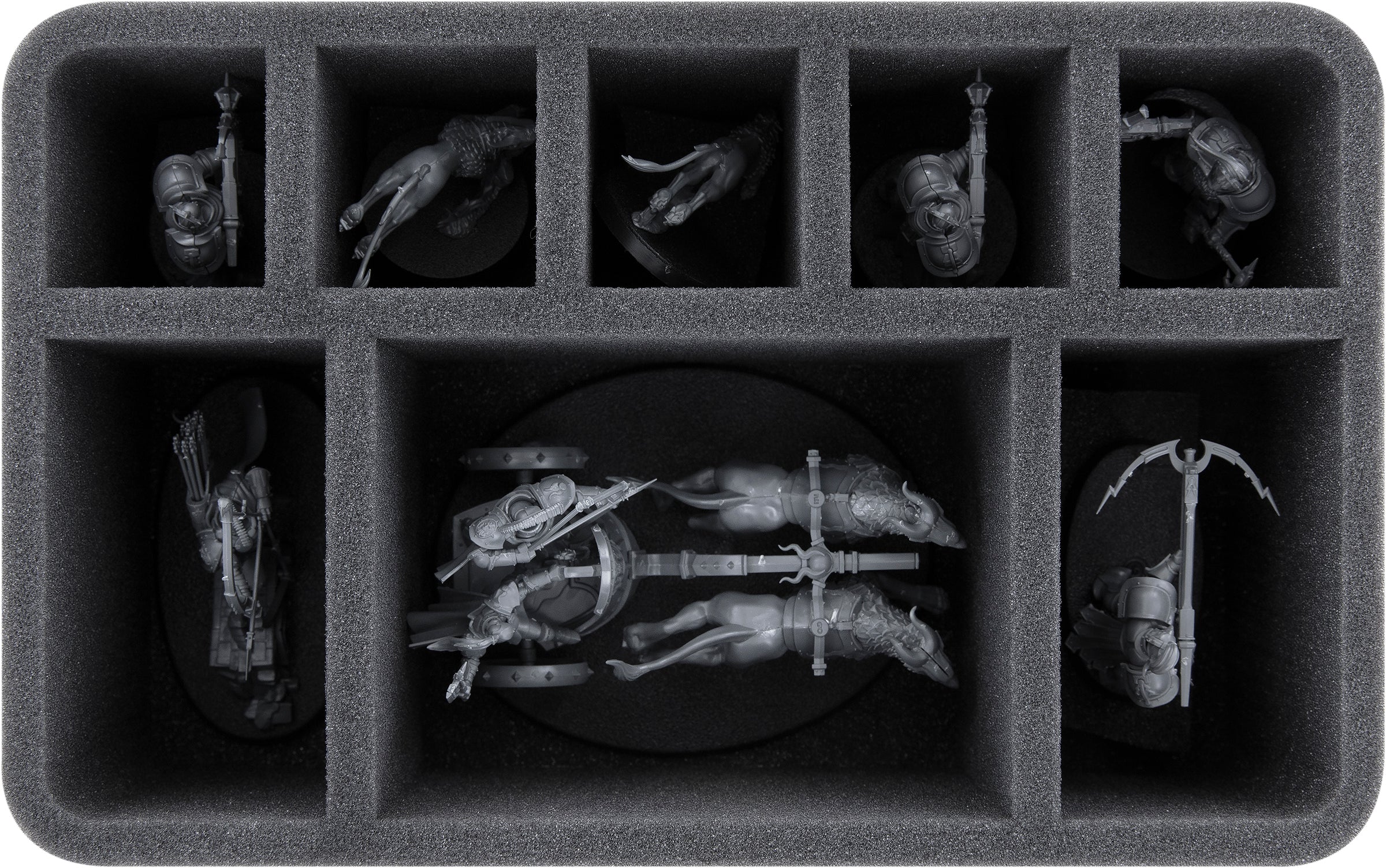 Custom-fit compartments of soft foam reliably protect your miniatures from damage and ensure that your painted units arrive safely at the tabletop without scratches.