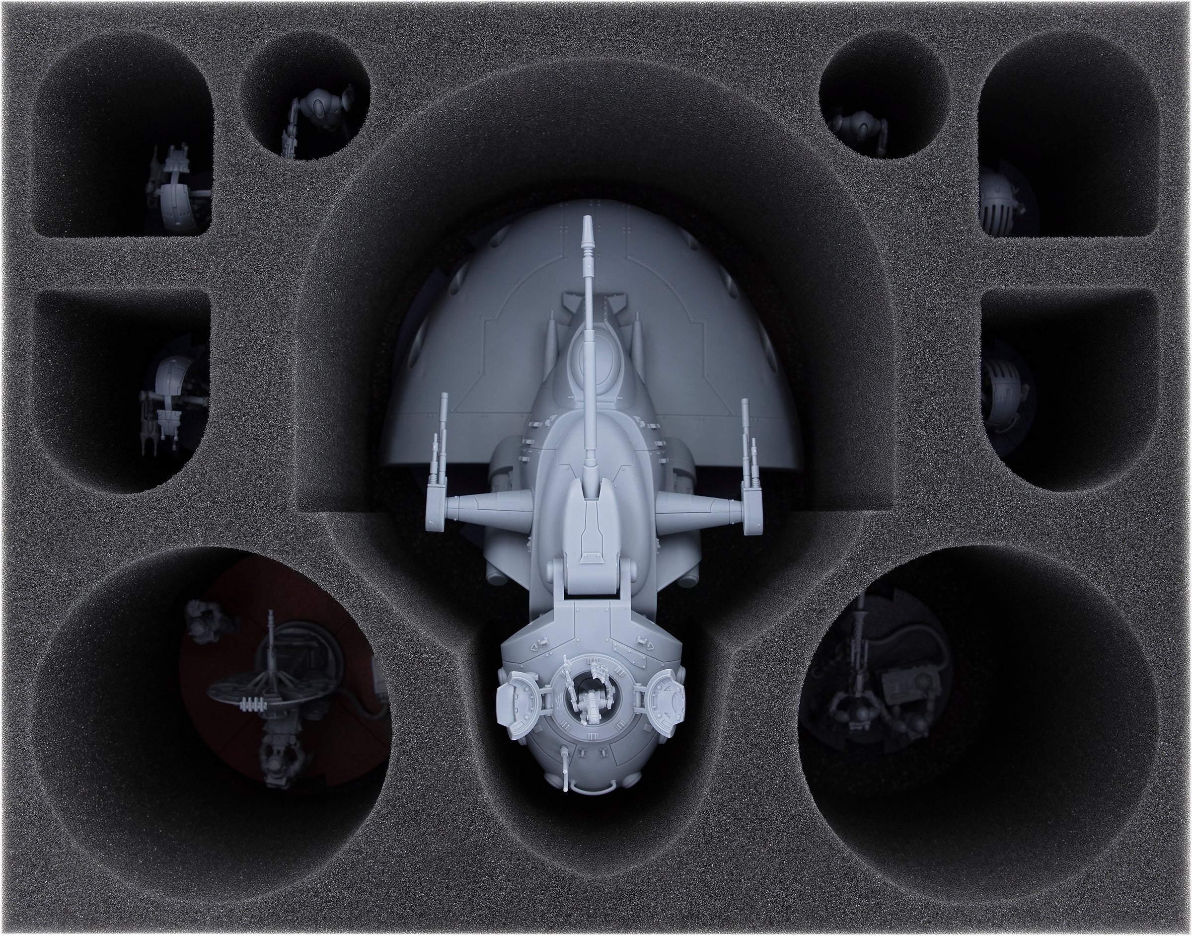 The large compartment in the middle of the foam insert FSMEWV135BO is tailored to a model of the AAT Battle Tank of the Trade Federation including base. The soft foam material protects the laser cannons, antennas and the droid in the turret reliable against damage. You can store additional units in the eight additional compartments. Two large round compartments are ideal for 1.4 FD laser cannon team or E-Web Heavy Blaster teams. 4 compartments are used as a shelter for Droidekas, for example. The two small round compartments can be used for standard infantry.