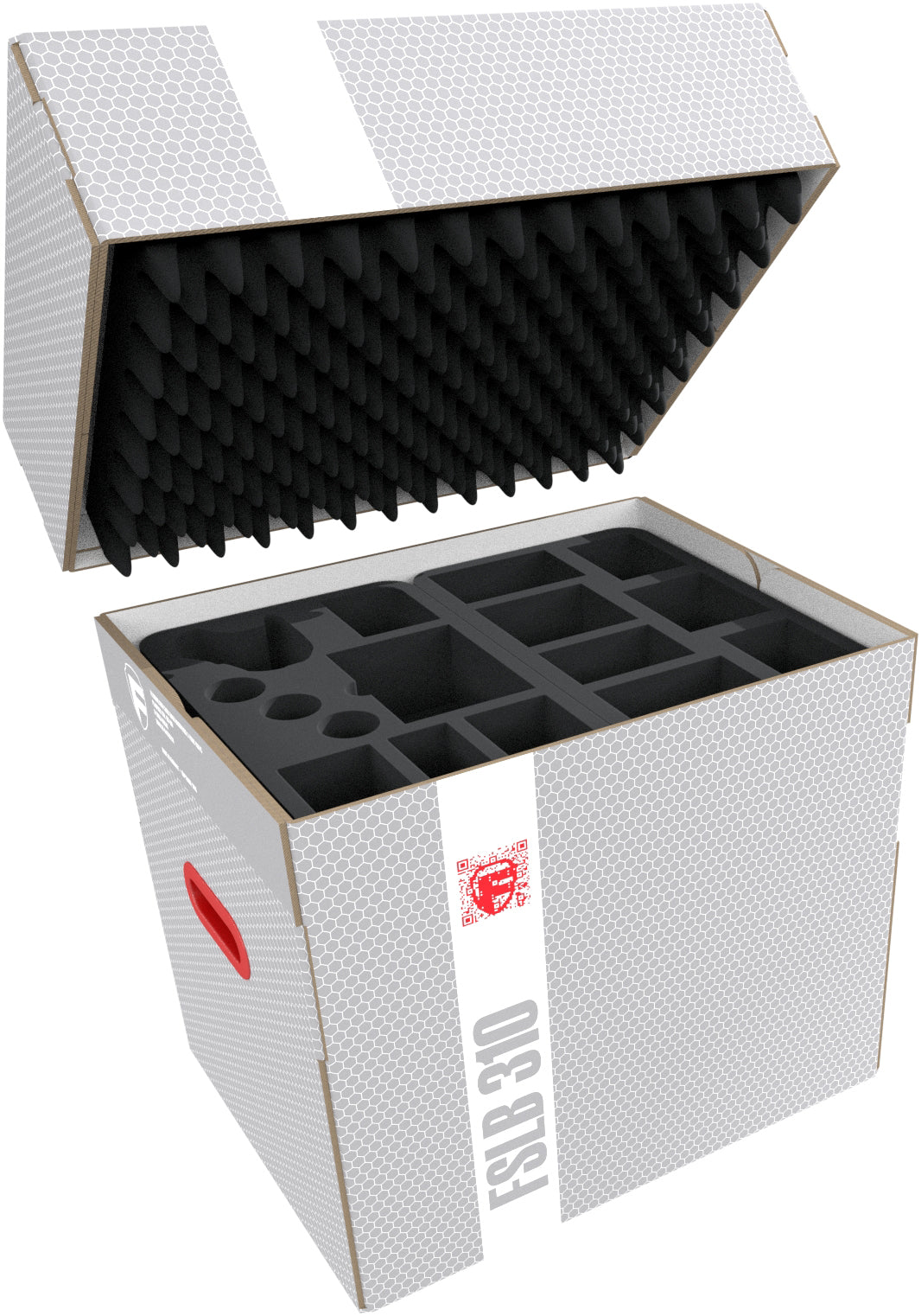 The storage box FSLB310 is made of coated, double-wall cardboard and is therefore both very light and very stable. The attachable lid reliably protects your miniatures from dust and other external influences. With the two plastic-reinforced carrying handles on the sides you can easily transport the box.