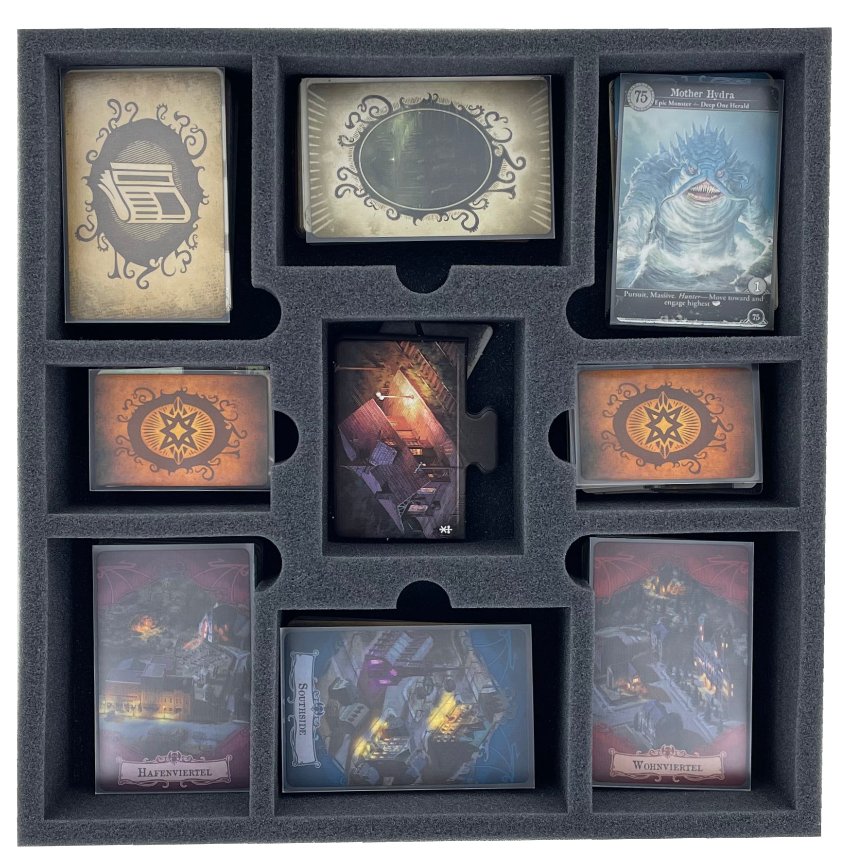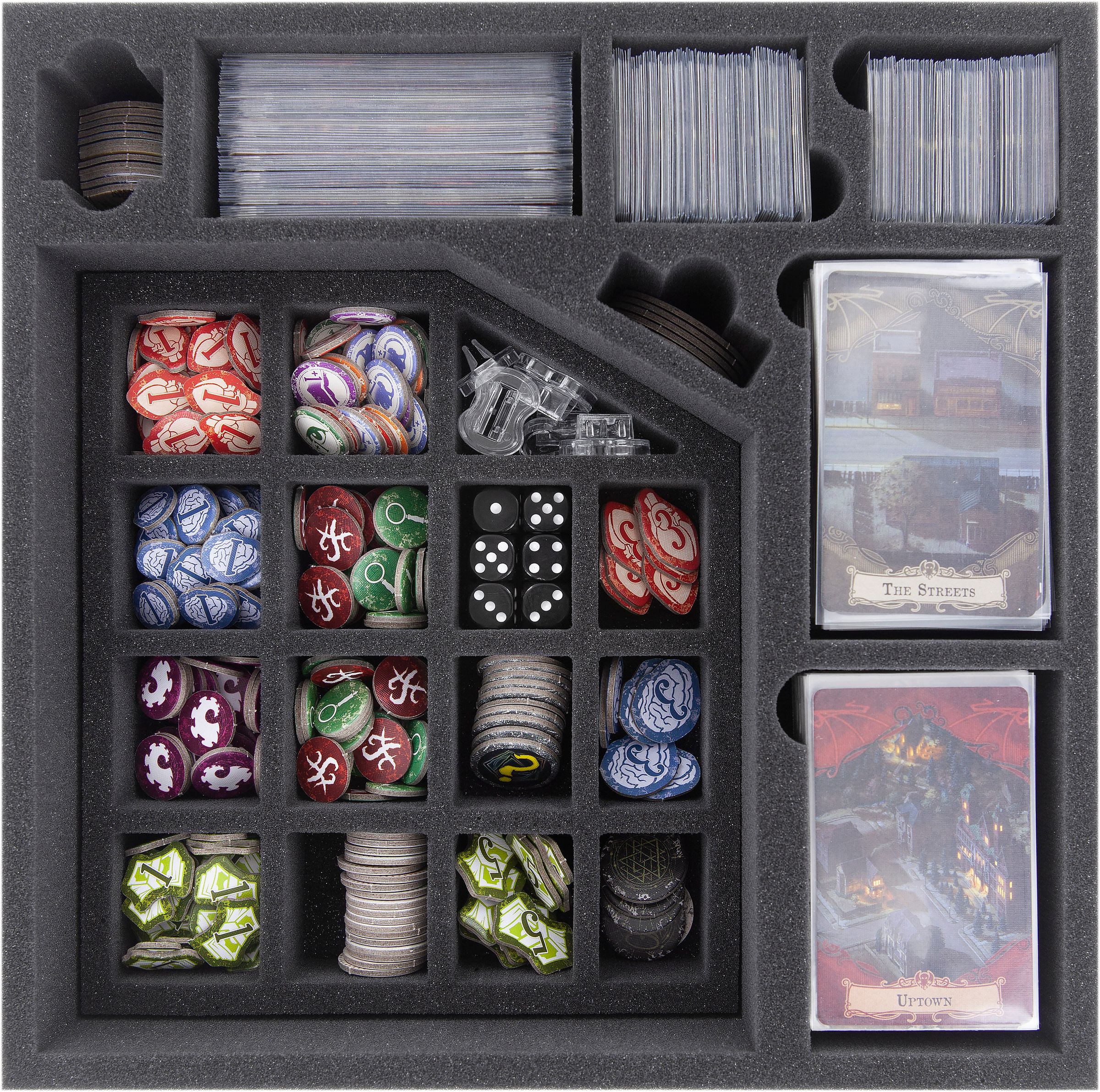 Each of the two inserts offers five compartments for different sized game cards. To store even more cards, use the additonal foam tray with 9 compoartments. This way, you can keep the large cards like event and anomaly cards, and the small cards like monster and condition cards, clearly sorted. Of course, all cards with protective sleeves fit into the compartments.