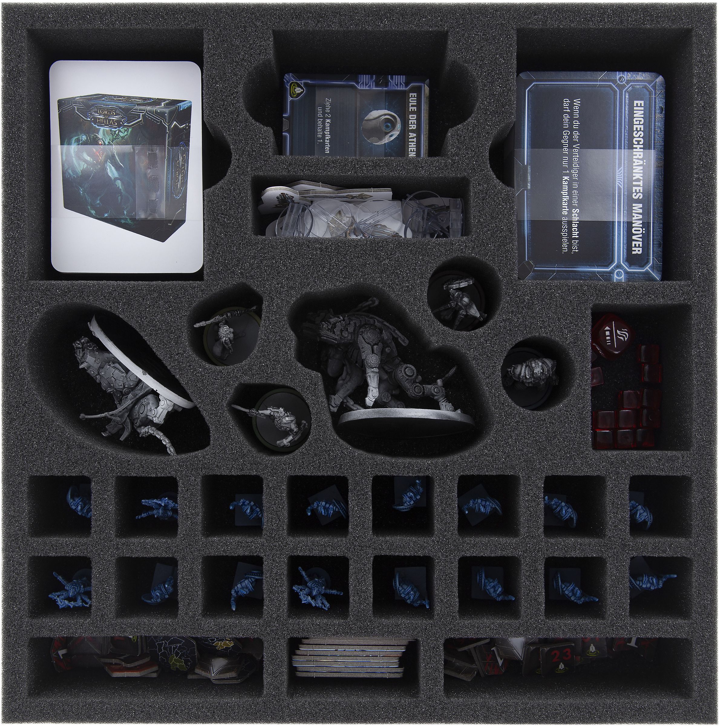 Thus all miniatures and the game material from the core game and the expansion are stowed safely and clearly on the foam mats.