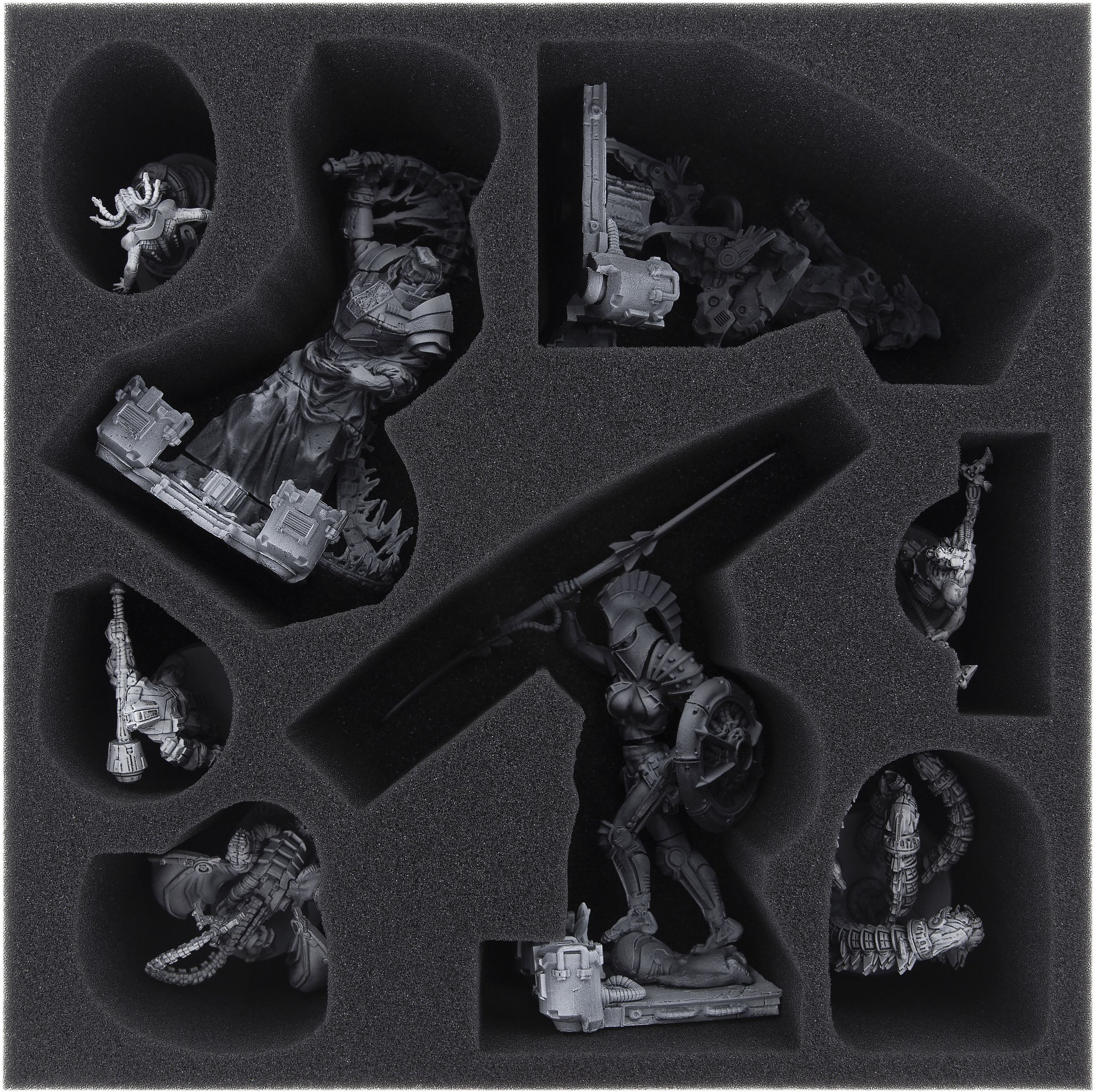 - Foam tray for medium-sized figures und game material: 285 mm x 285 mm x 55 mm total height (45 mm usable height + 10 mm foam base).