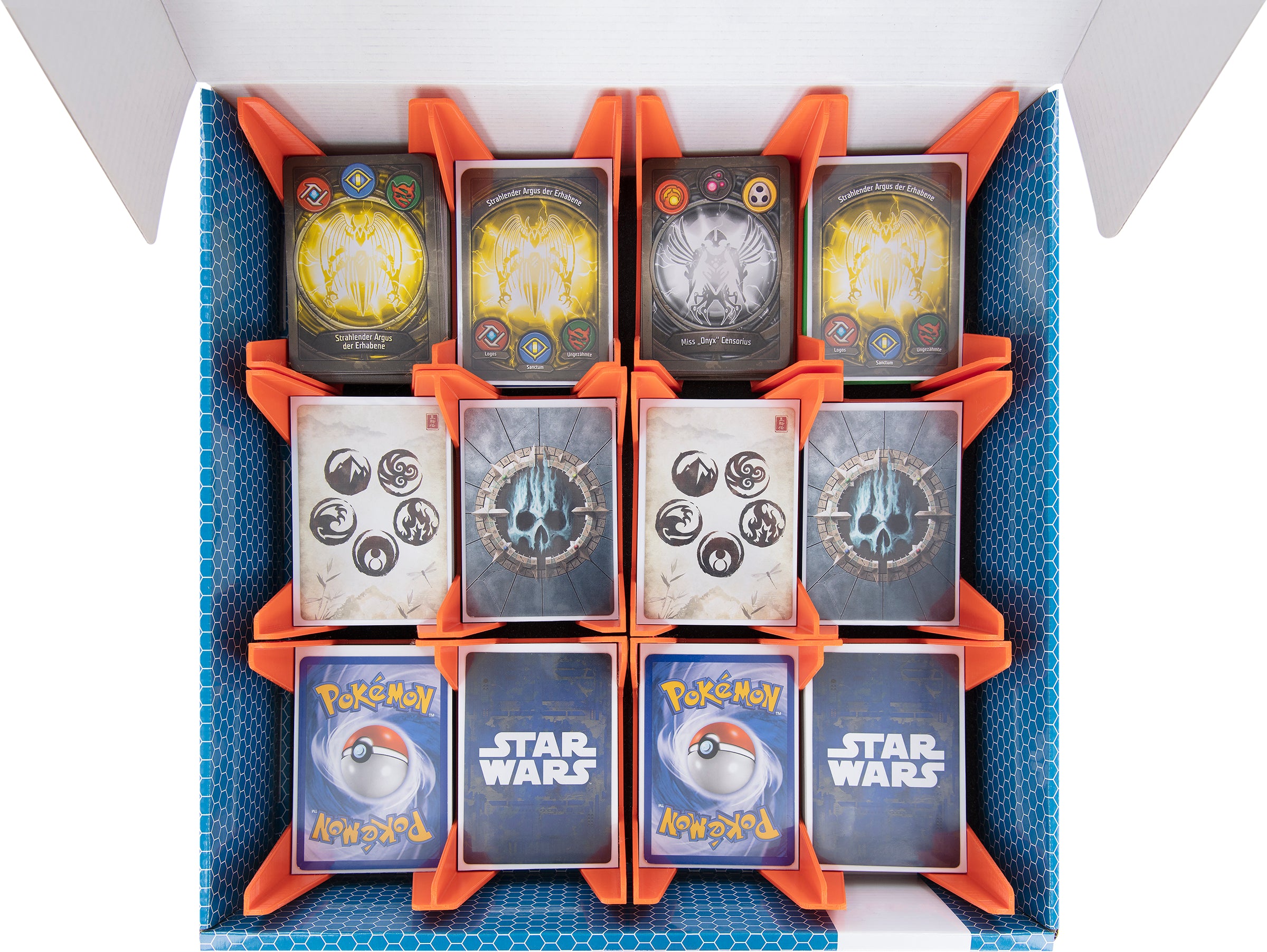 The card holders in the box hold up to 2520 cards without protective sleeves and 1260 with sleeves. You save a lot of space and can still neatly sort your cards. To show your collection to your friends, you simply take a single card holder from the box and press it into their hands. The compact box can also be stacked in an excellent and space-saving manner.