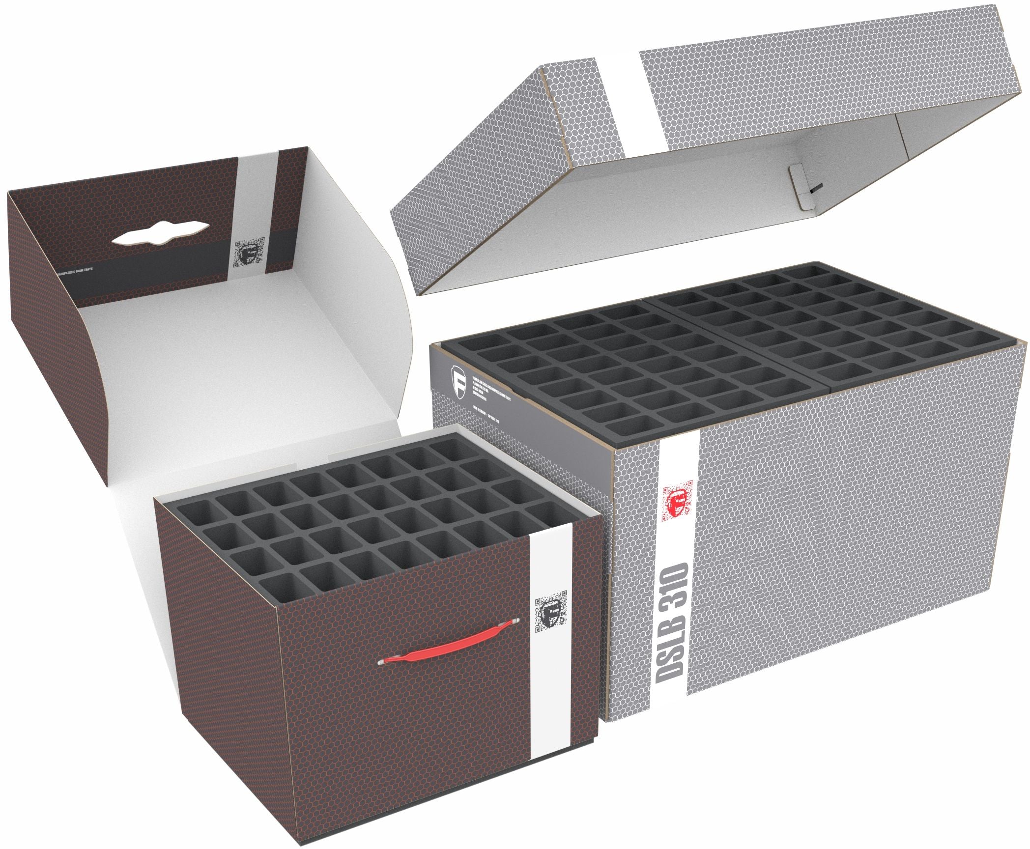 • Two sturdy storage boxes (DSLB310 and FSLB250) filled with custom-fit foam inserts for miniatures and game components