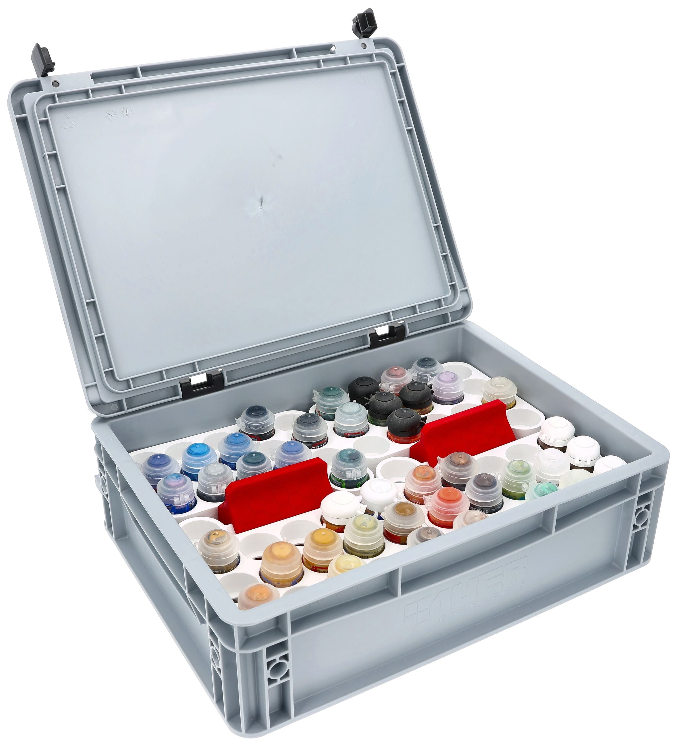 The 8 white paint racks offer space for a total of 128 small Citadel paint pots (12 ml). They can be removed individually or placed on the table as a whole with the matching insert rack. The rack itself fits exactly into the included AUER Eurobox – keeping your paint palette compact, portable, and protected.