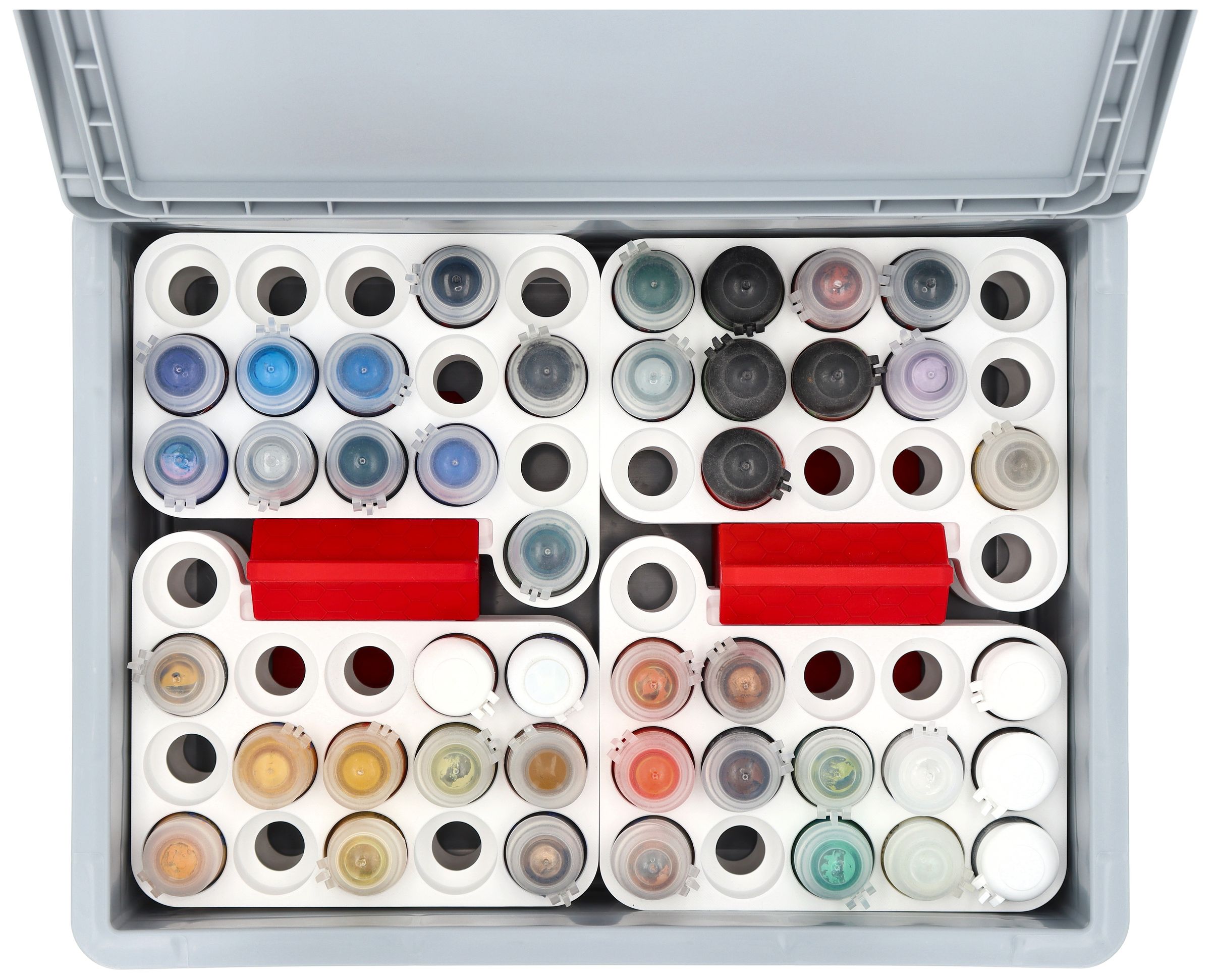 What started with a few miniatures and a couple of paint pots has now grown into a nice collection. Nice, but slowly becoming a bit messy. This set will help you bring order to your creative chaos: safely stored, neatly sorted, flexible to use at your workspace - and thanks to the sturdy box, it's also ideal for transport.