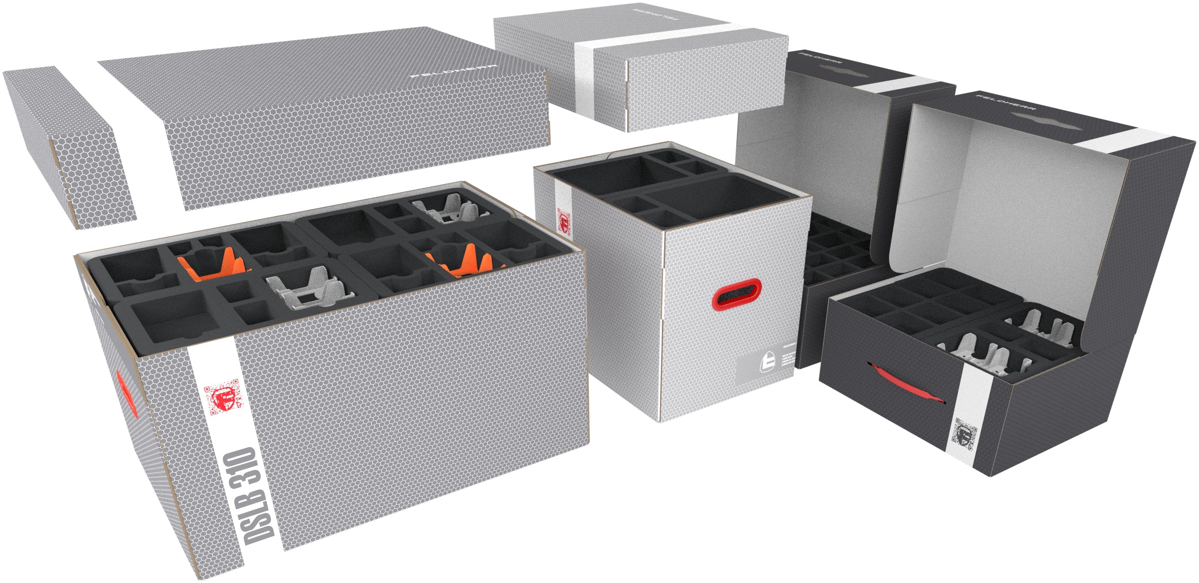 The Storage Boxes DSLB310 and FSLB310 are made of coated, corrugated cardboard. This makes them pleasantly light, very tear-resistant, and stable. The attachable lid reliably protects the contents from dust and other external influences. With the appropriate foam trays, miniatures, game material, and other goods can be stored safely — and conveniently transported with the two plastic-reinforced carrying handles on the sides.