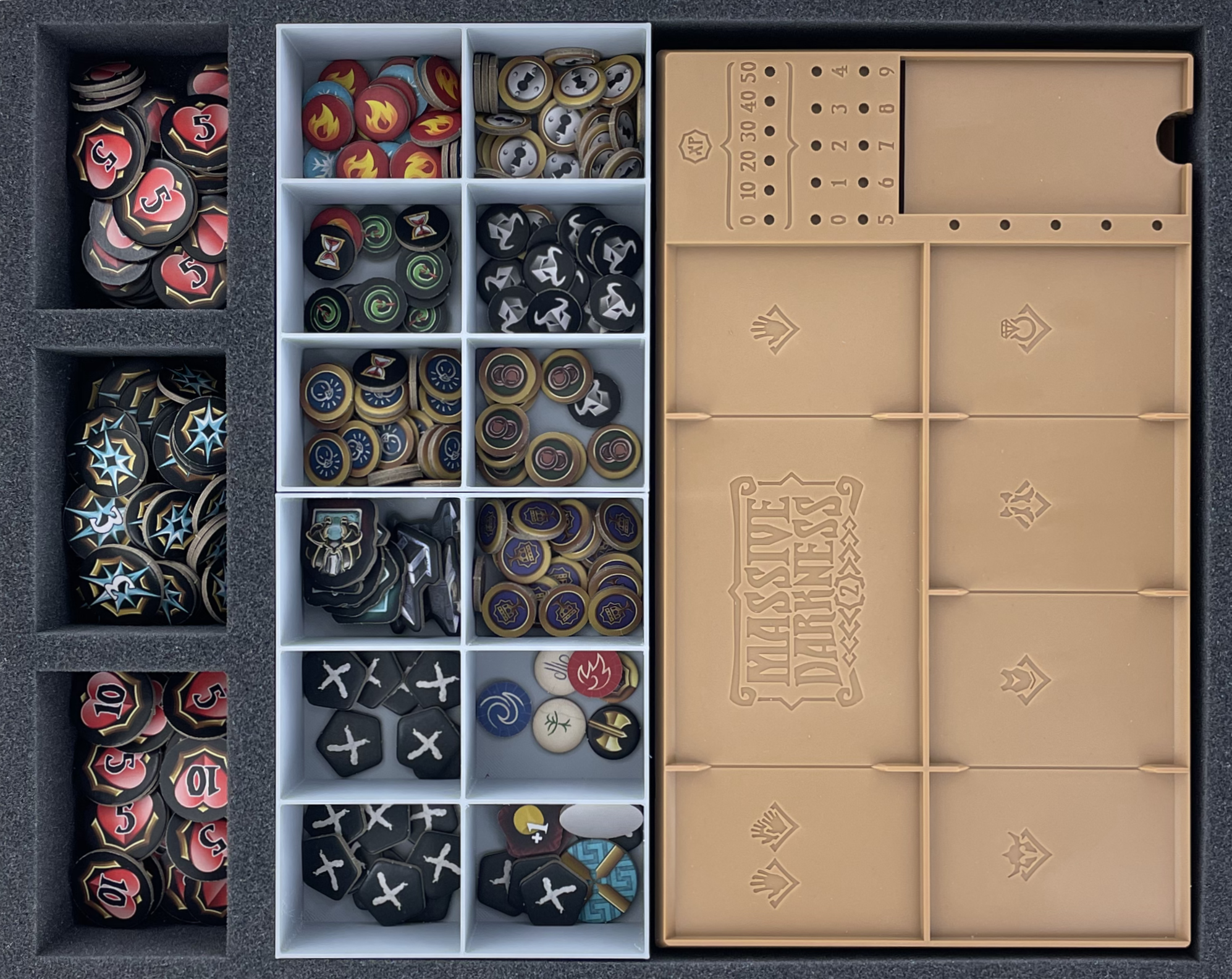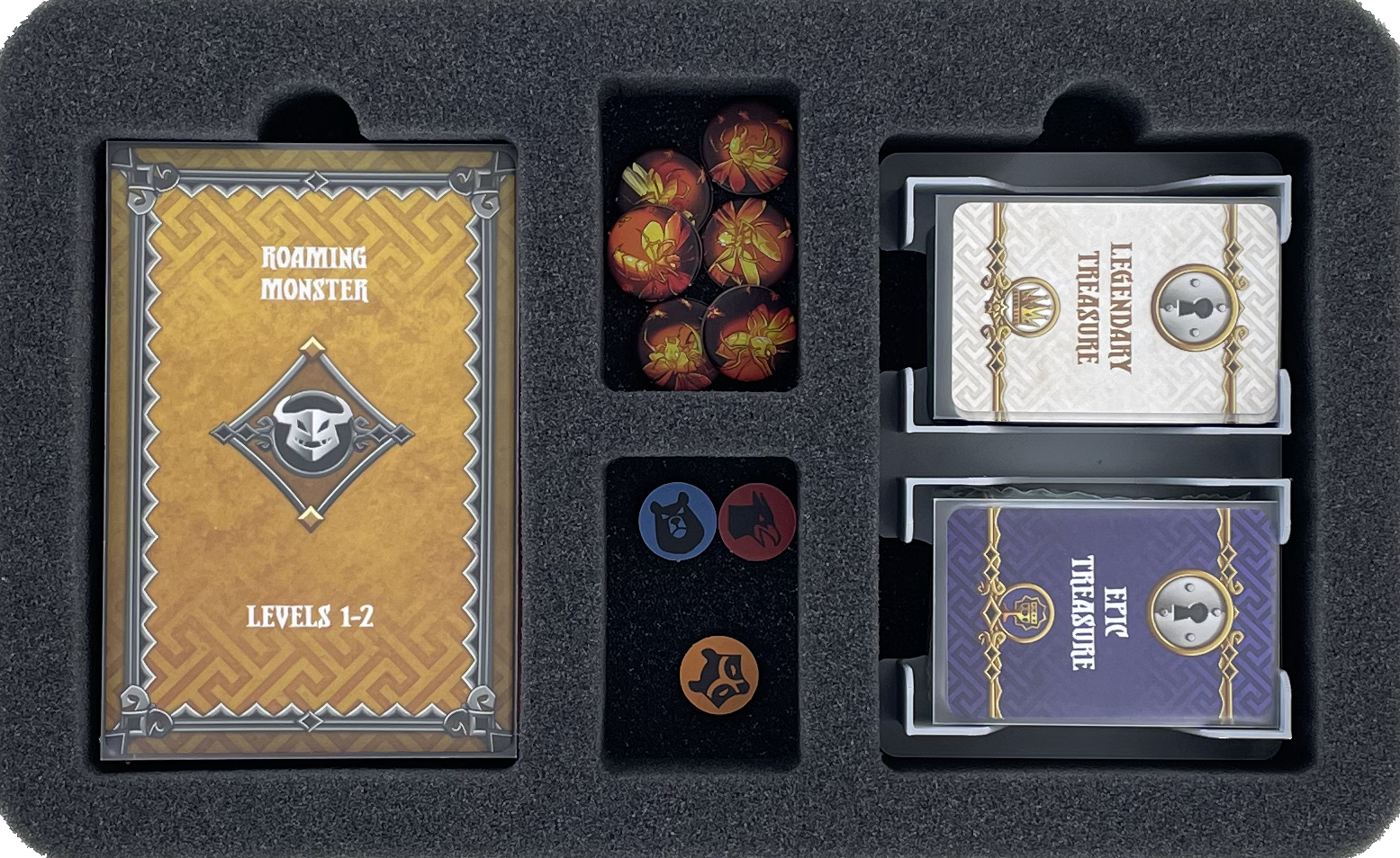 • 2 Full-Size foam trays with four compartments each for Game Tiles, Double-sided Boss Dashboards, Board Tiles, and small-sized game materials (2 x FS050I031BO)