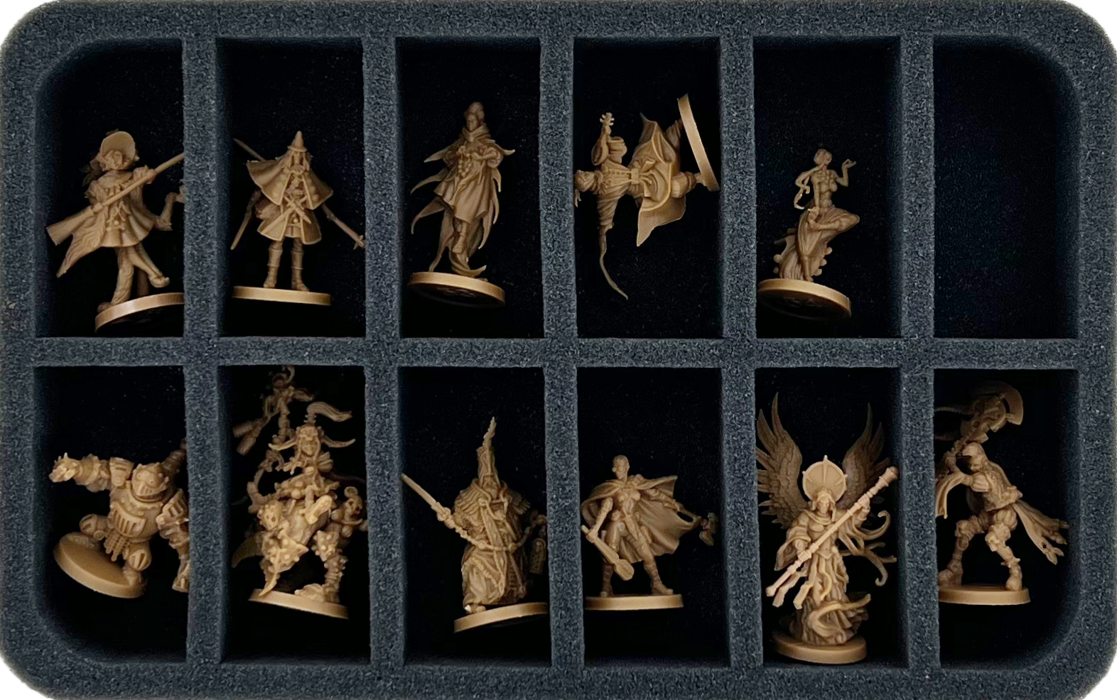 • 1 Half-Size foam tray with 12 compartments for normal-sized miniatures (HS040I012BO)