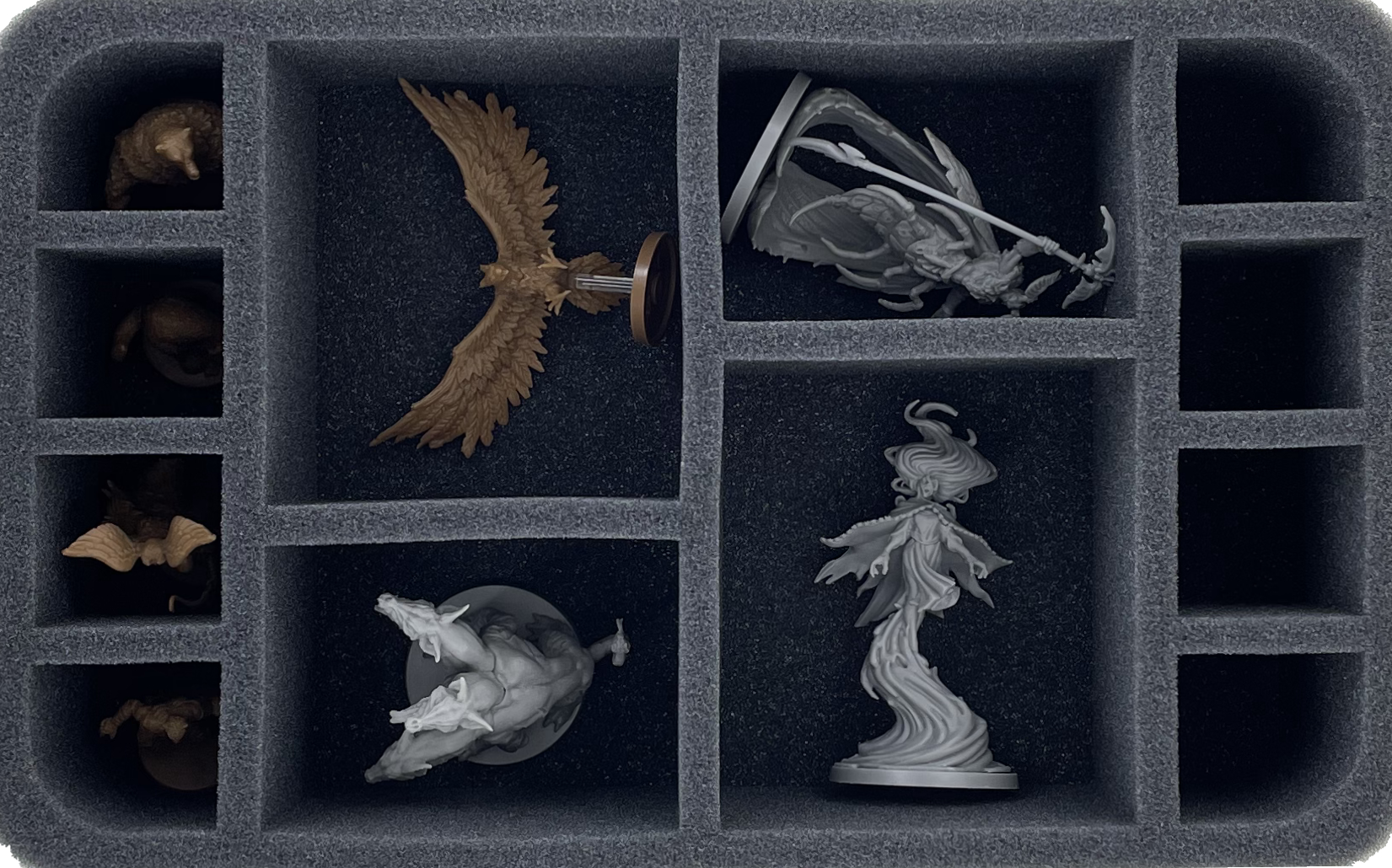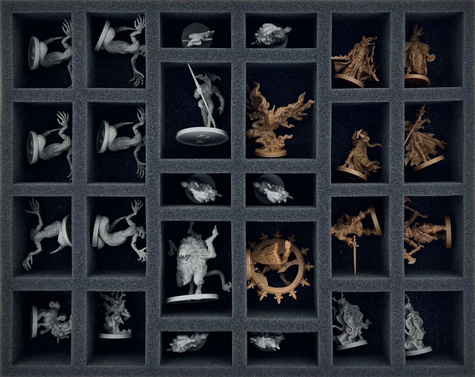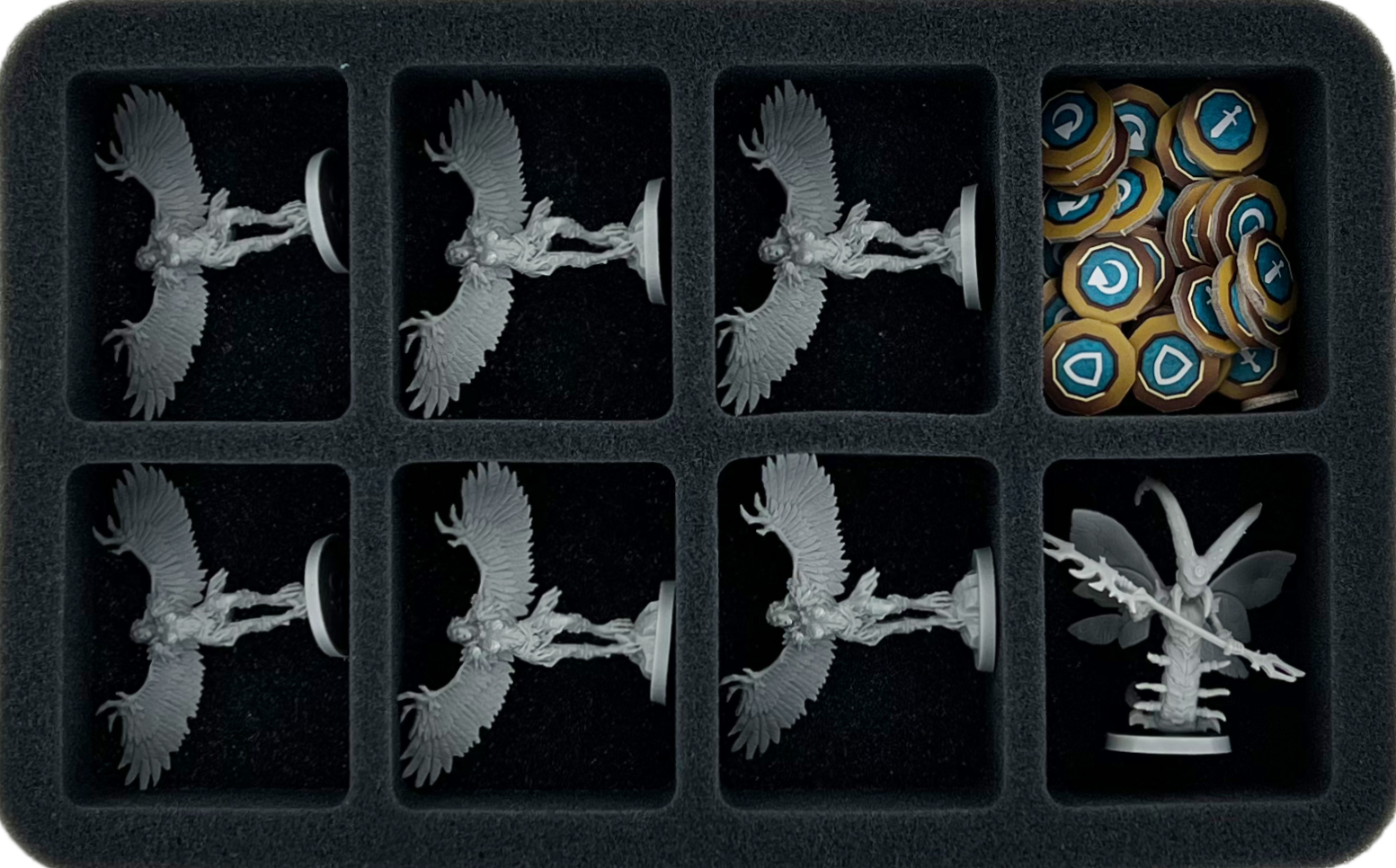 • 1 Half-Size foam tray with 8 compartments for protruding miniatures + tokens (HS040BF02BO)
