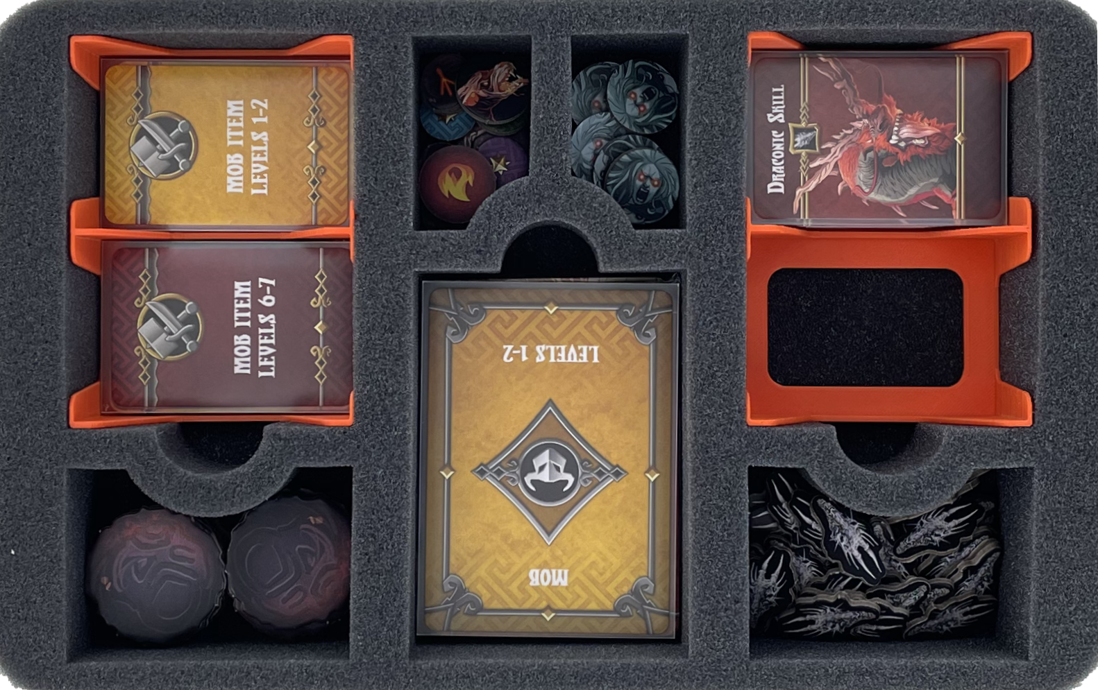 • 1 Full-Size foam tray with 13 compartments for standard-sized and small cards, as well as small-sized game material (FSLG050BO)