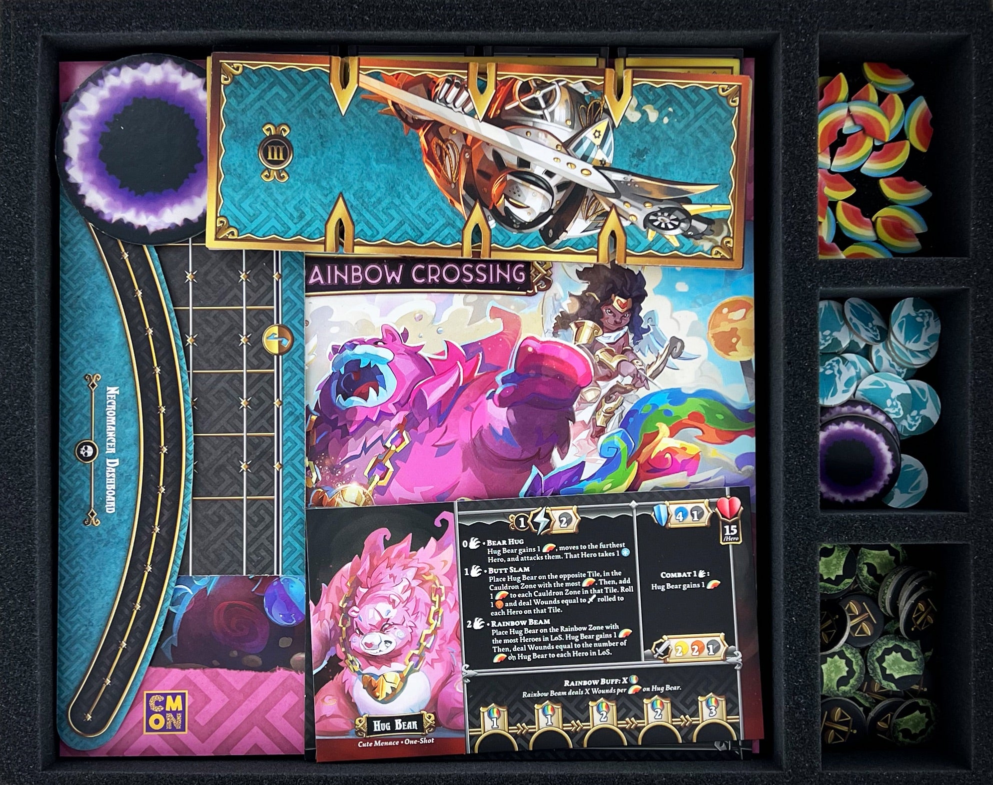 • Rulebooks, Spell Amulet, cardboard dashboards, Treasure Bag, and game components of similar size can be stored on the foam toppers of the various Storage Boxes.