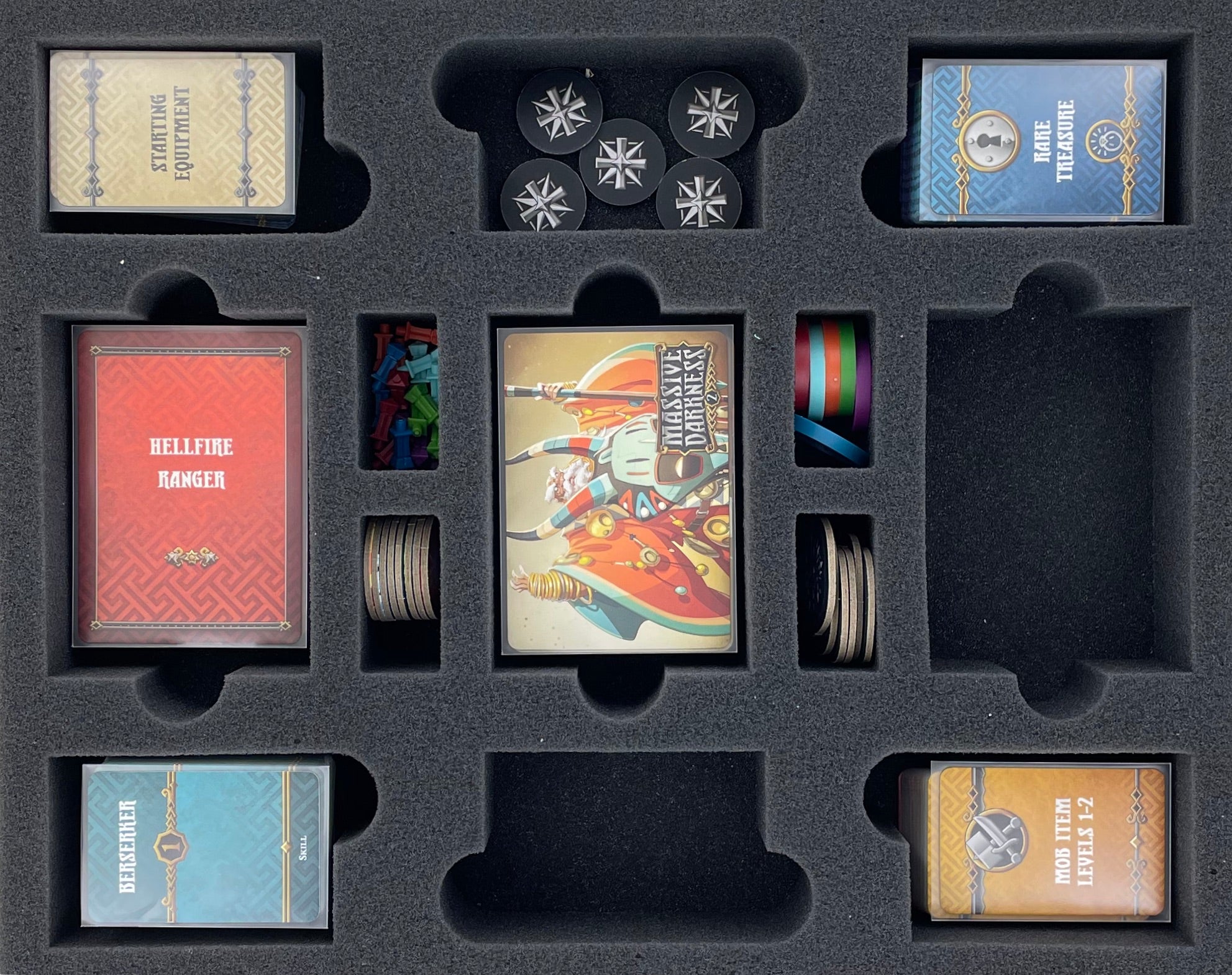 The game material and small miniatures from the “Demon Dragon” expansion fit into the Transporter kit. However, the large dragon figure is beyond the dimensions of our foam trays, and you have to transport it separately. Since the “Upgrade Pack” is designed for Massive Darkness 1, we did not consider it for this bundle.