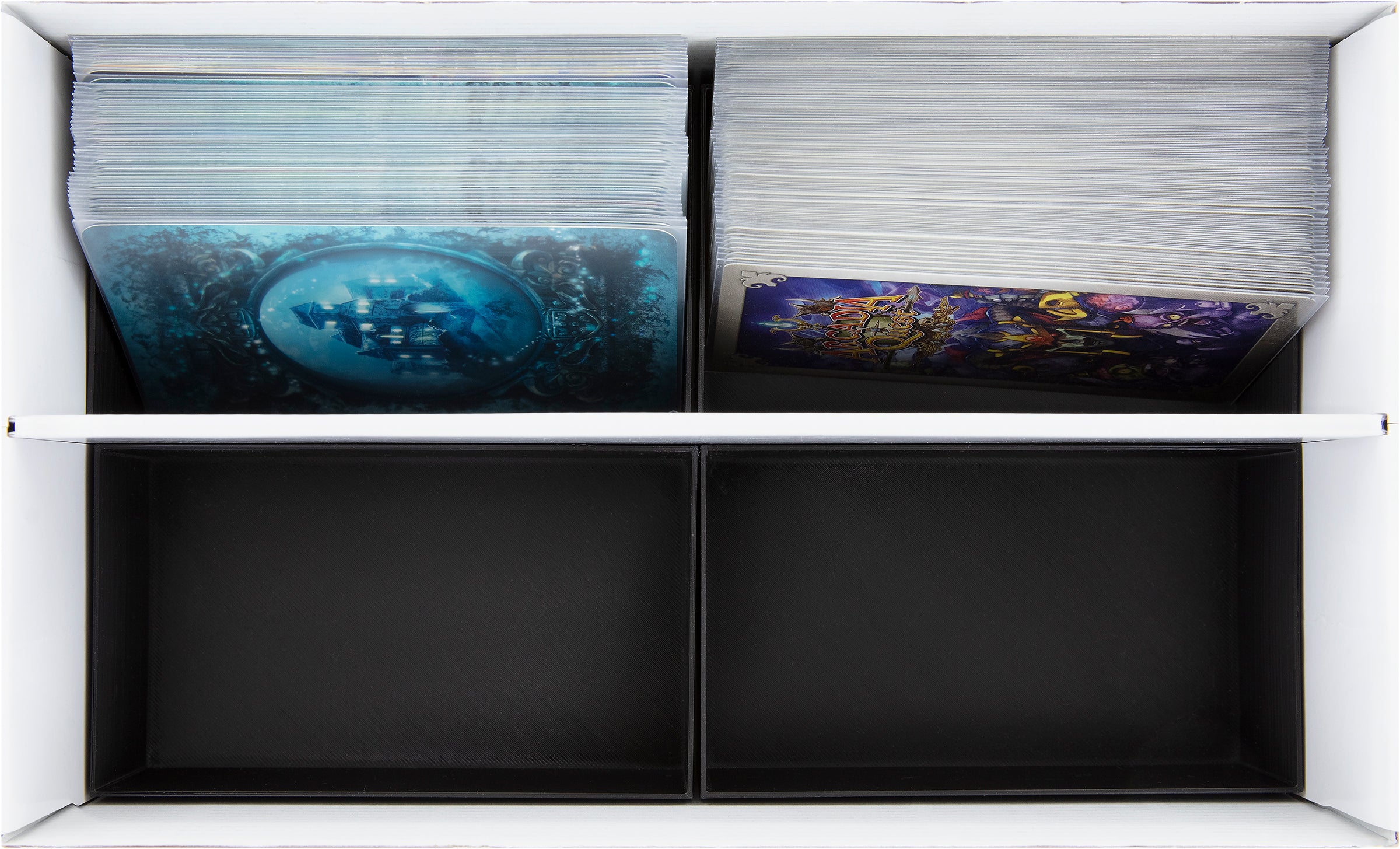 The Storage Box consists of two parts, a box, and a lid. Both parts are made of coated cardboard. A partition in the middle of the box divides it into two equally sized compartments. The slip-on lid protects the cards from dust and other external influences.