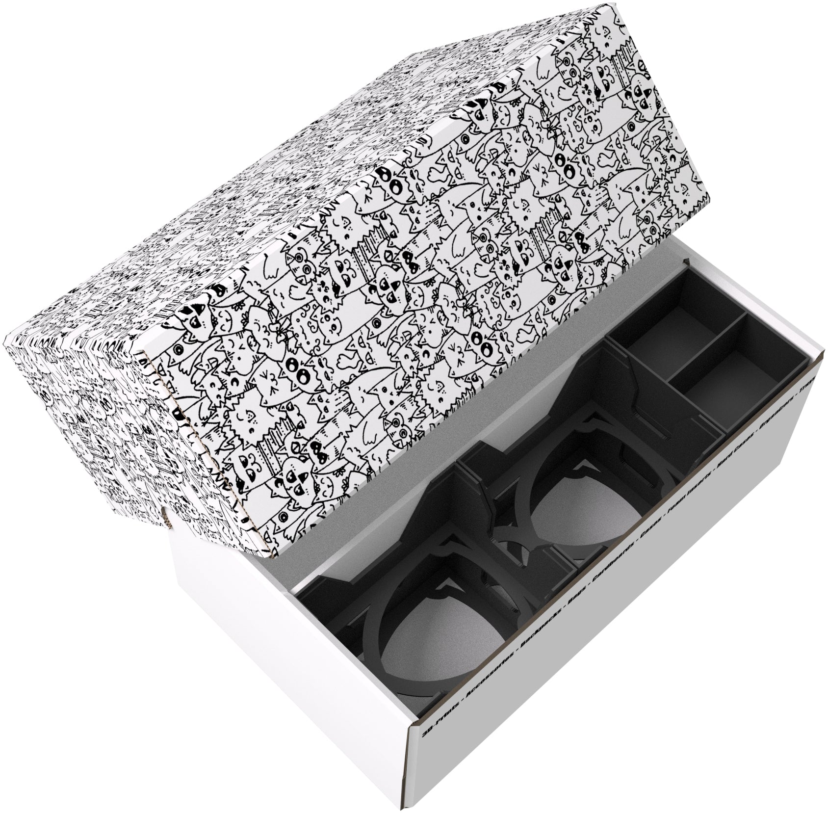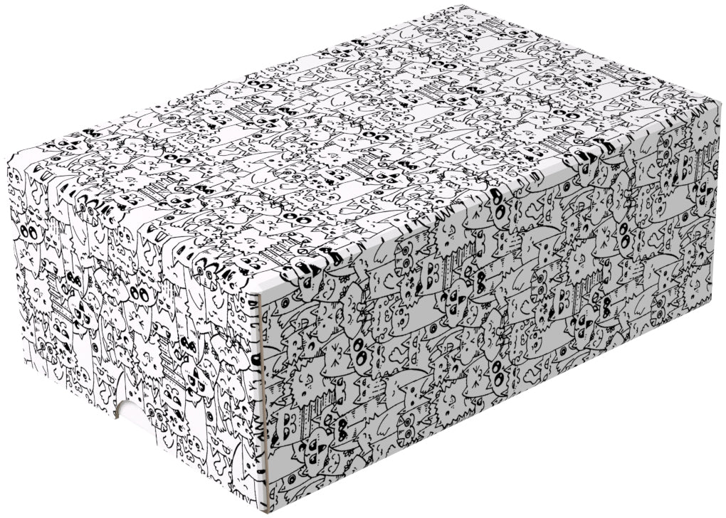 The Storage Box consists of two parts: a box and a lid. Both parts are made of coated cardboard. A partition in the middle of the box divides it into two equally sized compartments. The slip-on cover protects the cards from dust and other external influences.