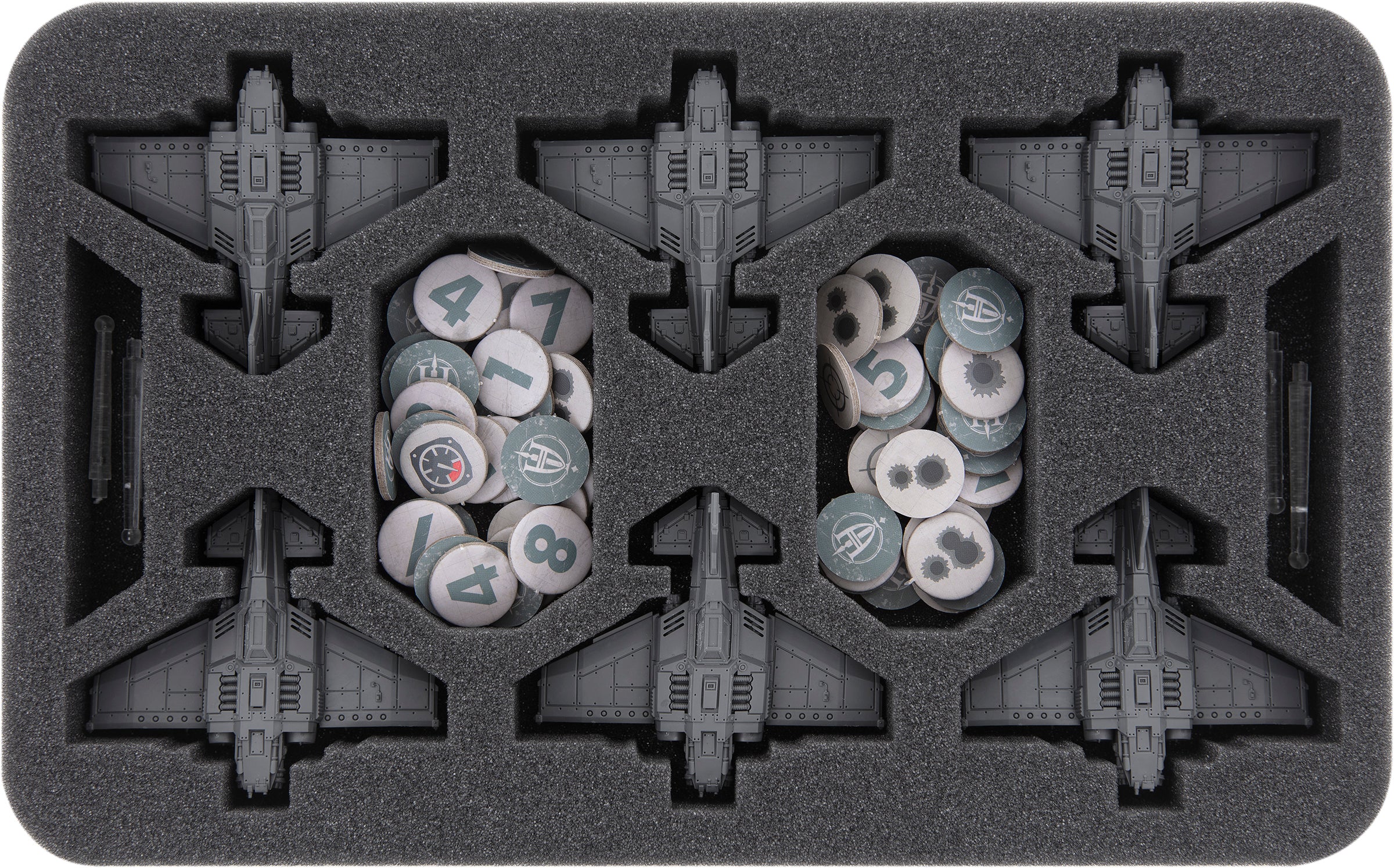 • 1 Half-Size foam tray with ten compartments for six Thunderbolt Fighter, flight stands and markers (HSMERJ030BO)