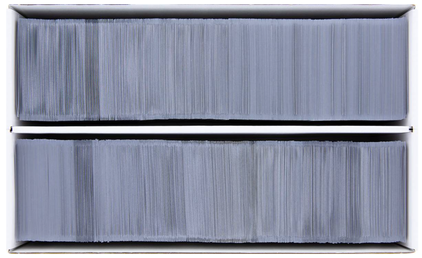 A divider in the middle of the box divides it into two equal-sized compartments. This allows the cards to be lined up neatly without mixing during transport.