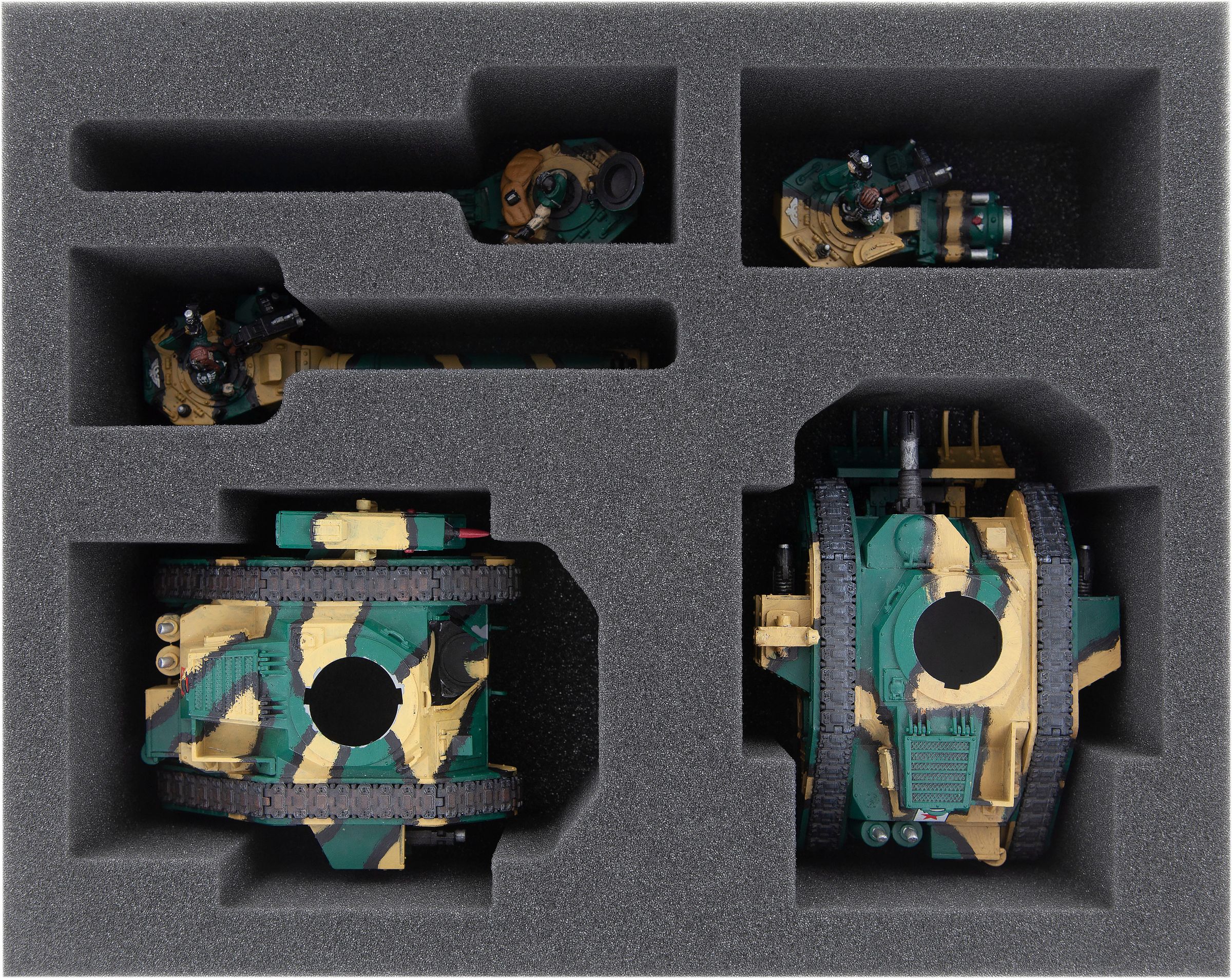 - 1 Full-Size foam tray with custom-fit compartments for 2 Leman Russ Battle Tanks and one additional turret (FSMELZ080BO)