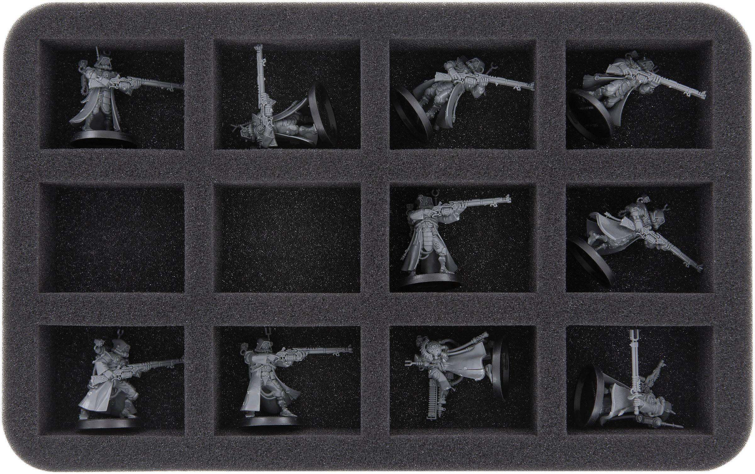 - 2 Half-Size foam trays each with 12 compartments for e.g. Officio Prefectus Commissar, Cadian Shock Troops (HS035I012BO)