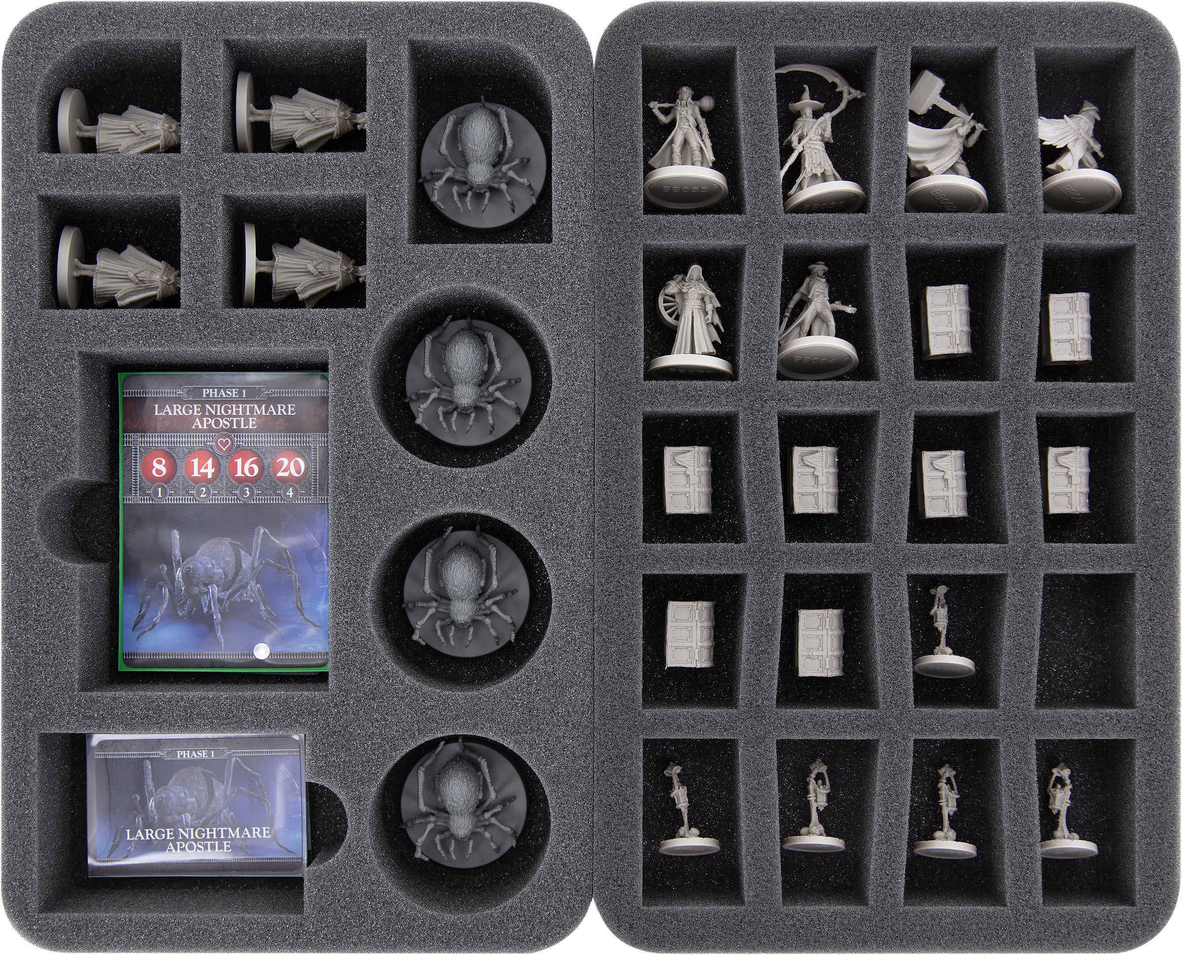 Four Half-Size foam inserts are included to store your models and cards. Whether it's the disgusting Large Nightmare Apostle, aggressive Great Huntsman, or a simple lamp, each figure is assigned a suitable and secure compartment.